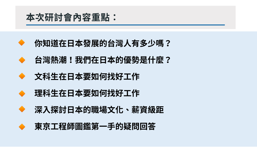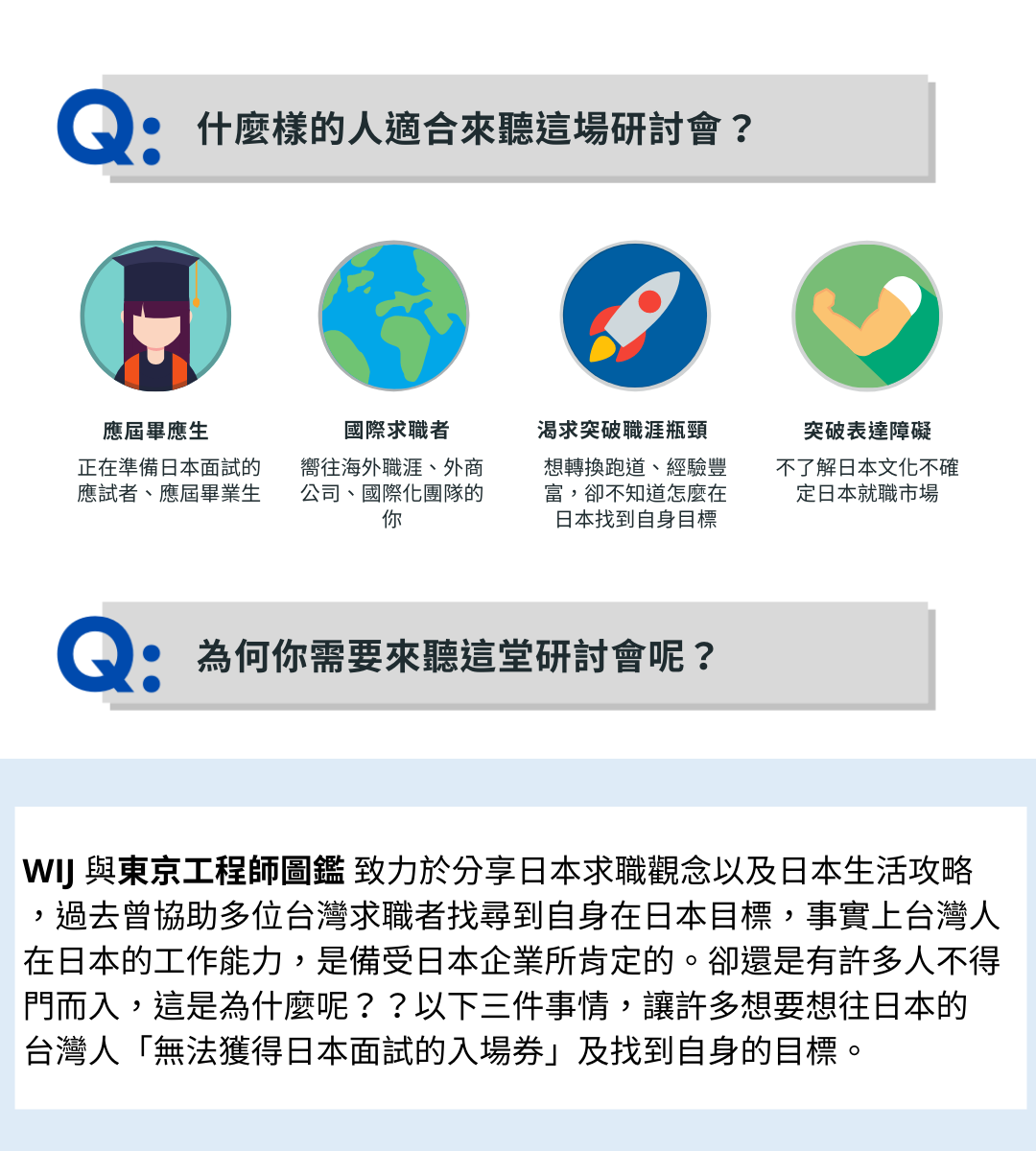 如果你想赴日工作,完成日本工作的夢想,那麼這次的日本職涯線上研討會是你的必聽內容!