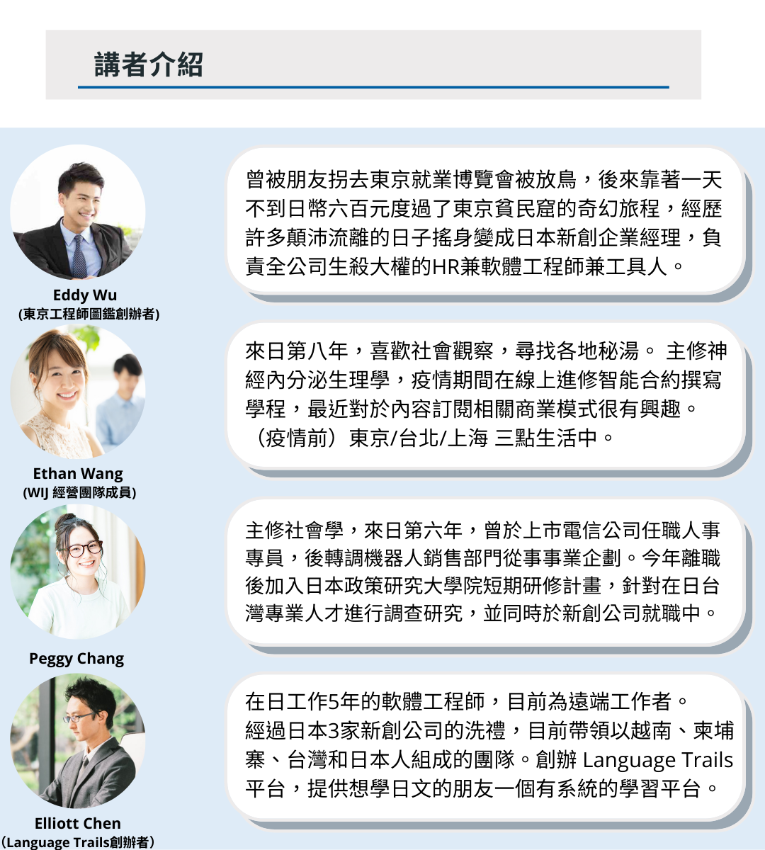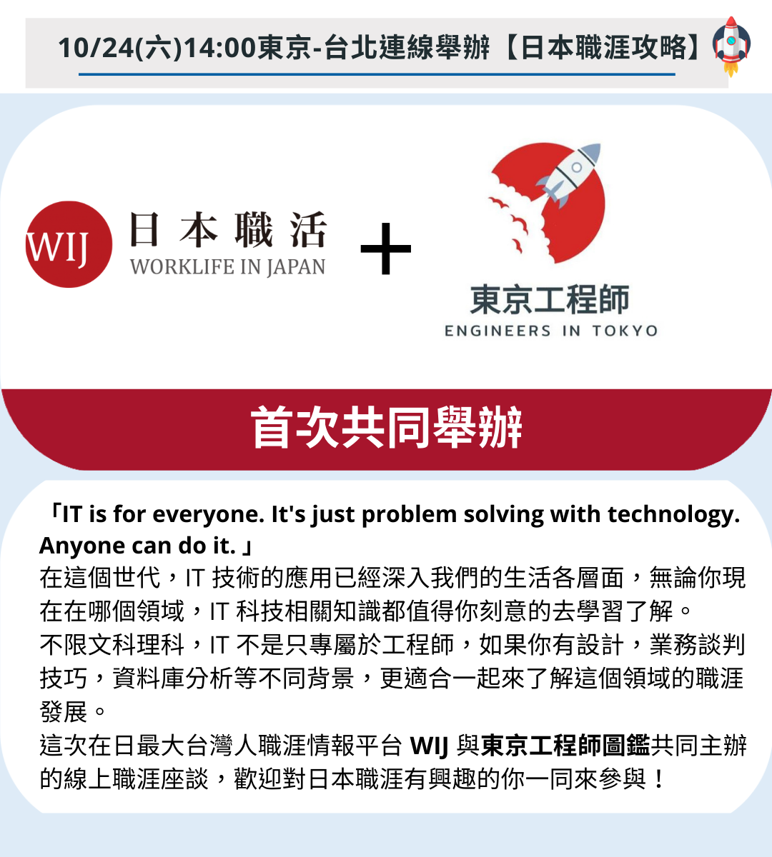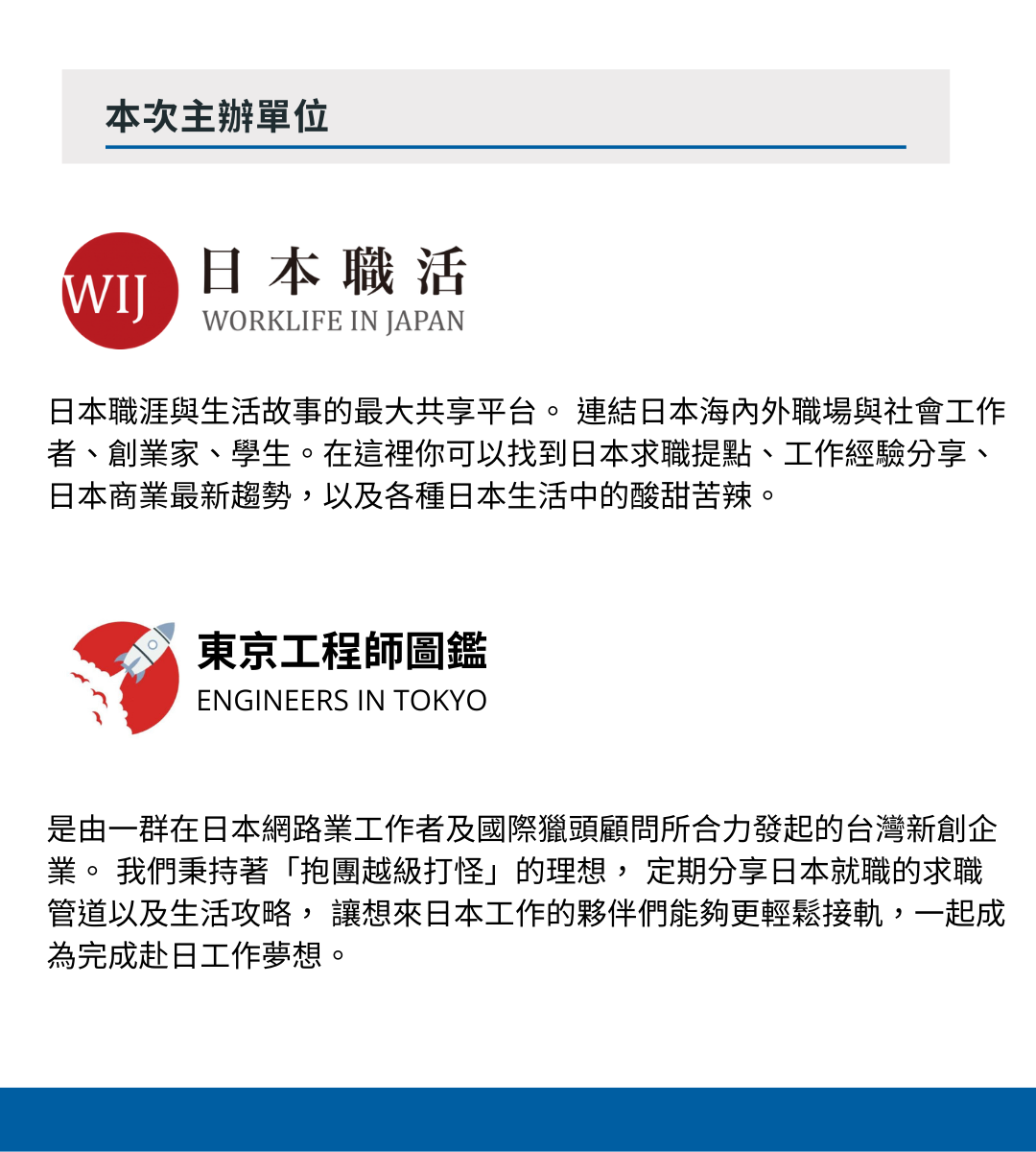 日本職涯線上研討會是由日本最大台灣人職涯社群 WORKING LIFE IN JAPAN、台灣在地新創企業 東京工程師圖鑑,共同舉辦的線上研討會