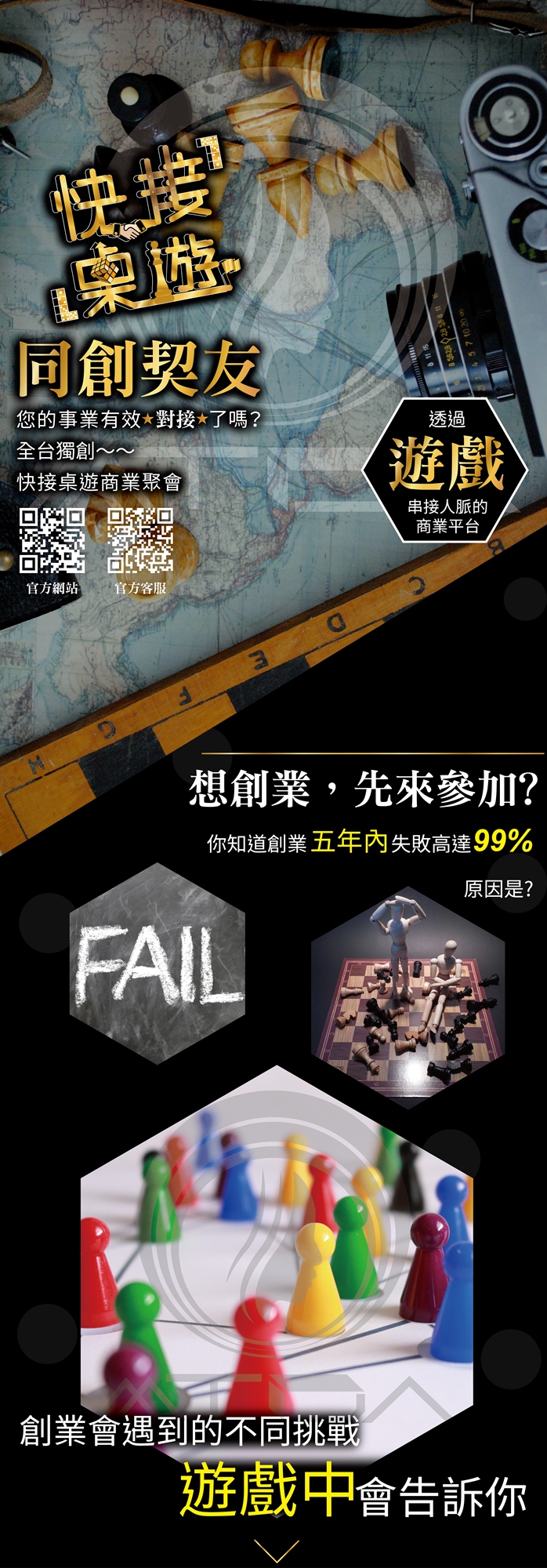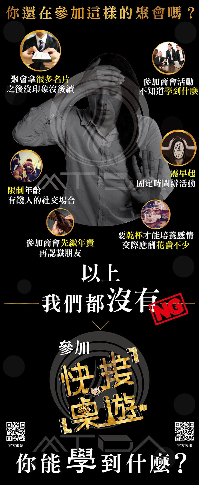 您的表現同時代表您個人與團隊的品牌形象,快接桌遊活動內容豐富,來賓多因引薦而參與,素質優良,您給他人的第一印象僅有一次,請您尊重其他來賓的時間,提早出席爭取與其他來賓互動的機會。