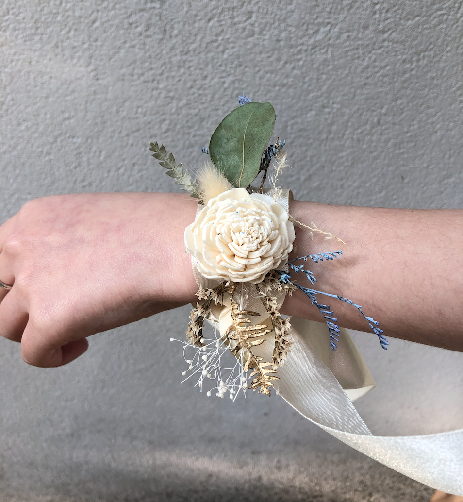 將緞帶上裝飾乾燥花,完成後即可成為可以綁在手腕上的裝飾花藝,通常使用於婚禮伴娘或閨蜜派對