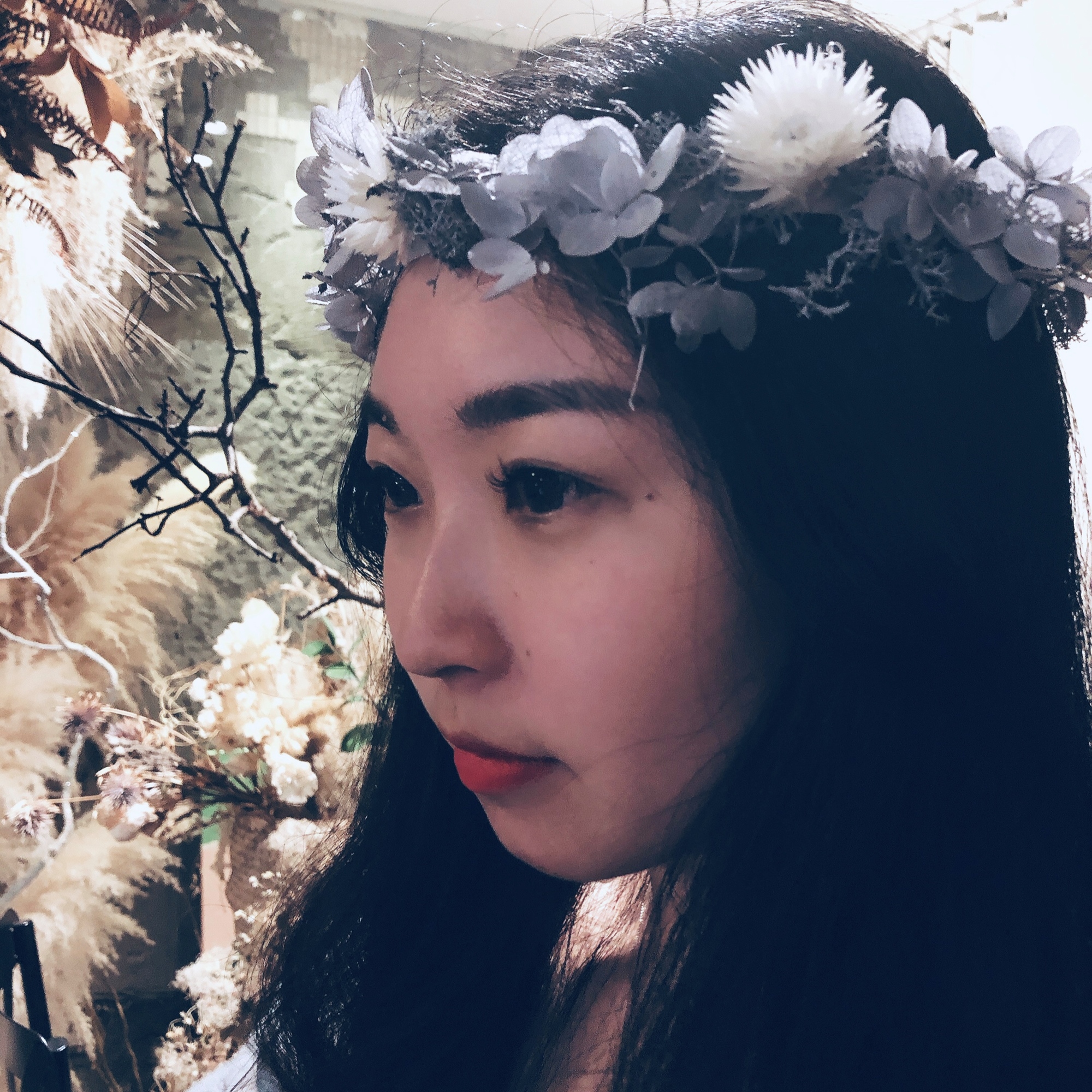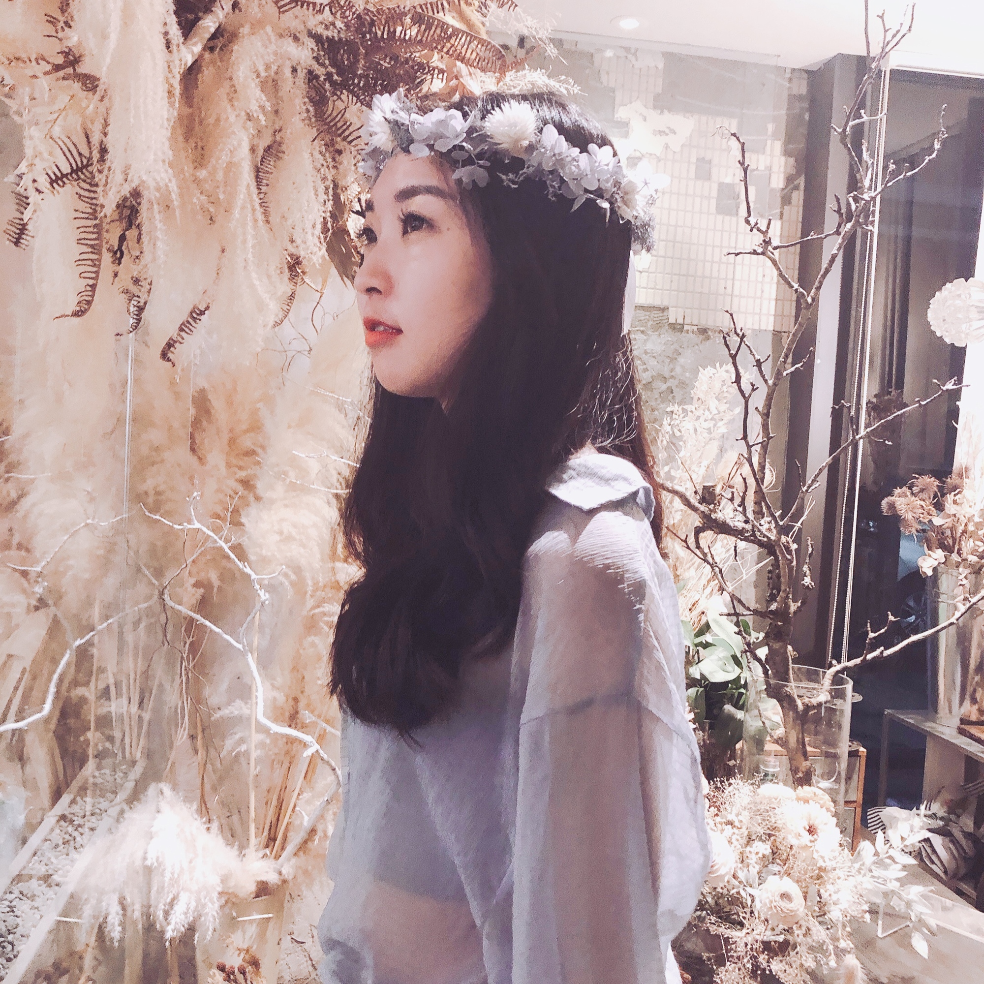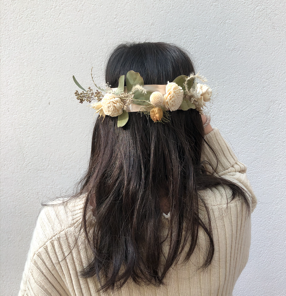 將緞帶上裝飾乾燥花,完成後即可成為可以綁在頭上作為裝飾花藝,通常使用於婚禮伴娘或閨蜜派對