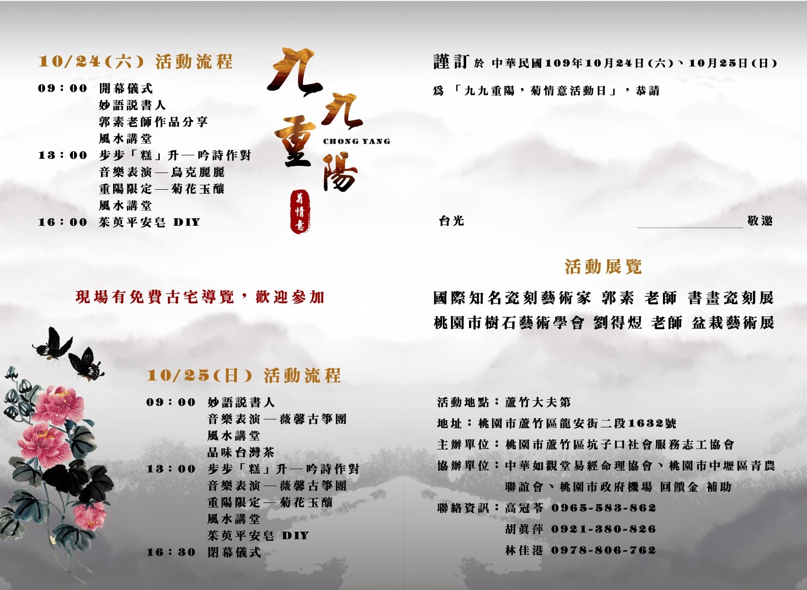 每年農曆九月九日,九九重陽節。傳統習俗上更有登高、敬老與闔家團聚之習俗。然而現代科技發展速度,漸漸取代了人情溫暖。許多富含意義的傳統節日與禮節,已經逐漸被淡忘。透過本次藝文活動,邀請您一起於輕鬆愉悅的氛圍中,體驗傳統文化的價值與溫度。