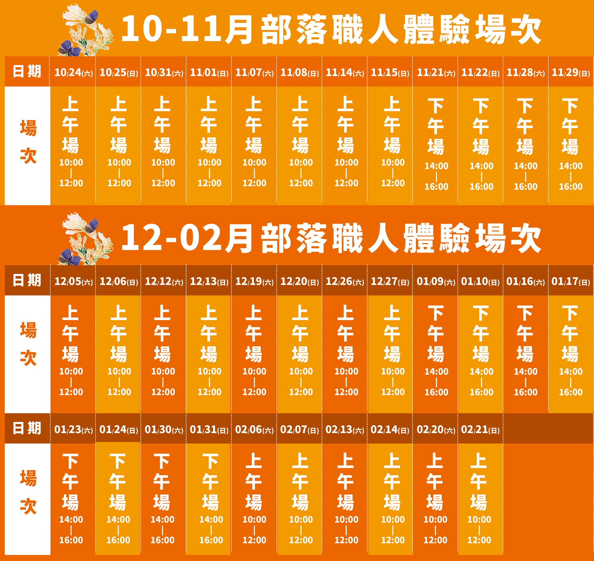 本活動採預約報名制,活動僅開放活動期間的每個周末,歡迎朋友們揪團一同來參與,可自行選擇日期、時間及體驗品項報名(一日僅接一團客)