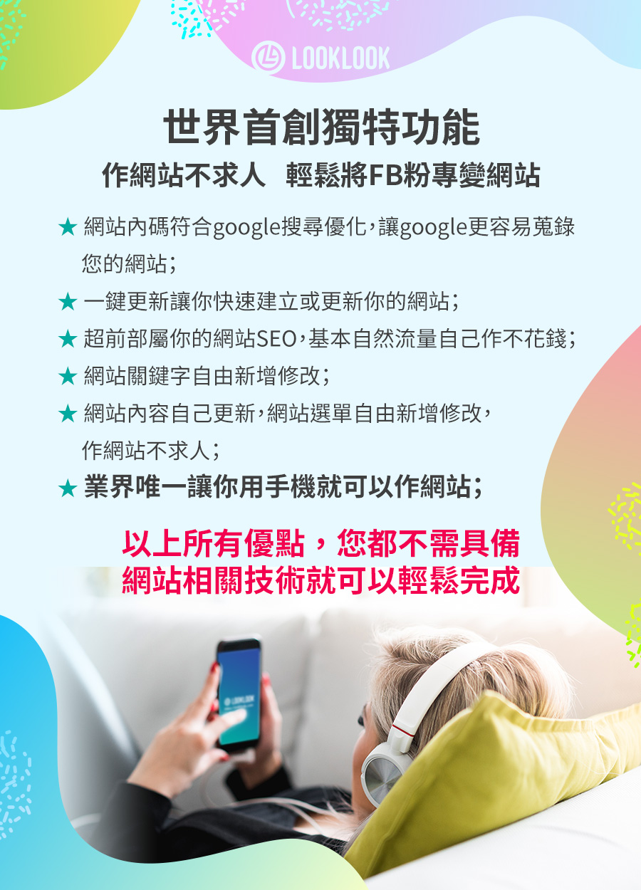 LOOKLOOK看看線上科技為了讓每一個想要有網站但卻礙於價錢貴、製作繁瑣、人手不夠、後續維護麻煩等等因素而遲遲無法擁有一個自己網站的朋友們。LOOKLOOK看見了這個不方便進而開始思考如何讓一個網站創建是方便、低價並且不增加人力負擔的方法。LOOKLOOK做到了,讓我們一起將Facebook粉絲專頁變網站吧!您將體驗一個網站的成立是如此的輕鬆簡單。