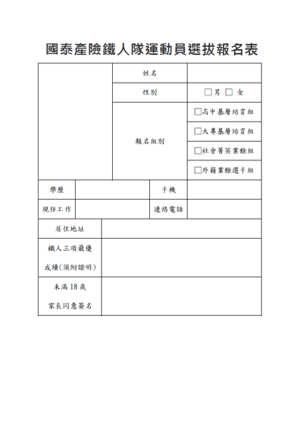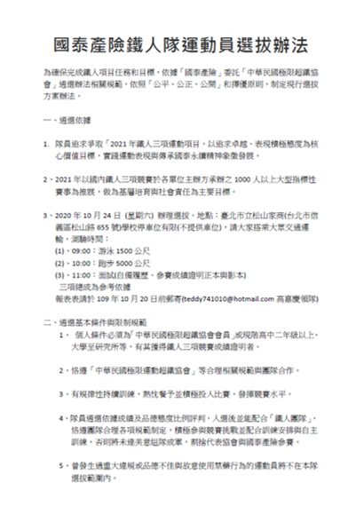 - 個人條件必須為「中華民國極限超鐵協會會員」或現階高中二年級以上、 大學至研究所等,有其獲得鐵人三項競賽成績證明者。