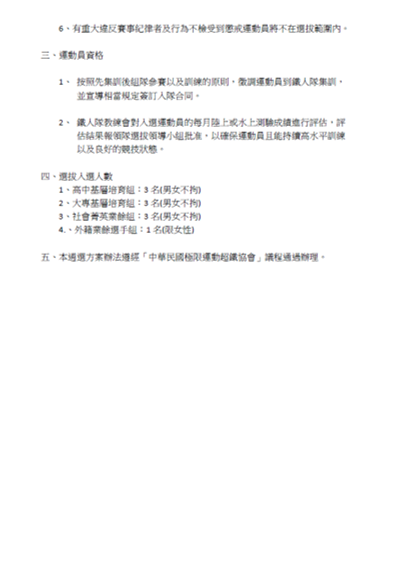 五、本遴選方案辦法遵經「中華民國極限運動超鐵協會」議程通過辦理。