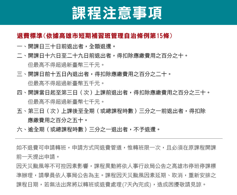 A 參考下方高雄好課退費標準、活動通退費方式。