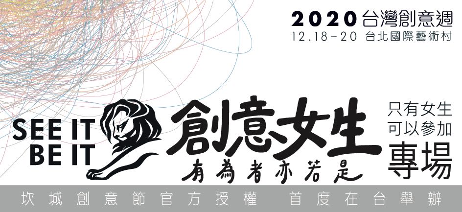 16:05-17:00 | 【創意女生有為者亦若是】【文化改變】創意女生專場 2020 年台灣創意週獲得坎城創意節授權,在台首度舉辦坎城創意節的女性領導人培力活動,See It Be It 創意女生有為者亦若是,這是一場僅限生理女性參加的專場活動。請創意女生不要錯過兩位主講人都擔心他們會「抱在一起哭」的分享。 無法參加活動的其他性別者也不要難過,只要購買的是套票,就會獲得粉紅色的 2020 年台灣創意週紀念電繡章喔!