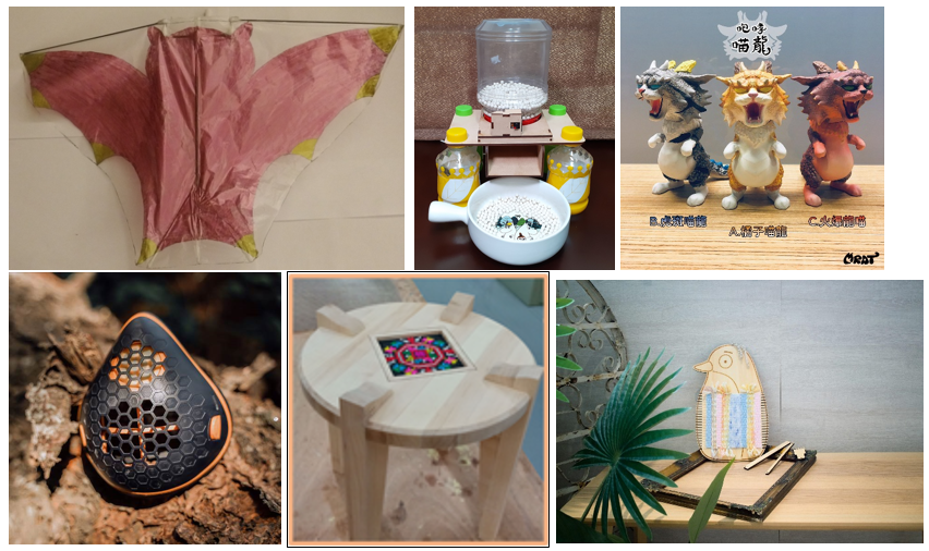 (上排由左至右:仿生飛行器、物聯網遠端視訊寵物餵食器、咆哮喵龍