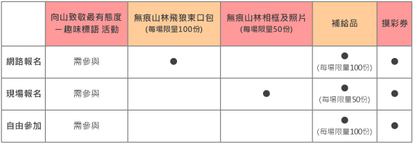 2.參與現場舉辦之「向山致敬最有態度 ─ 趣味標語」活動,即可獲得摸彩劵乙張