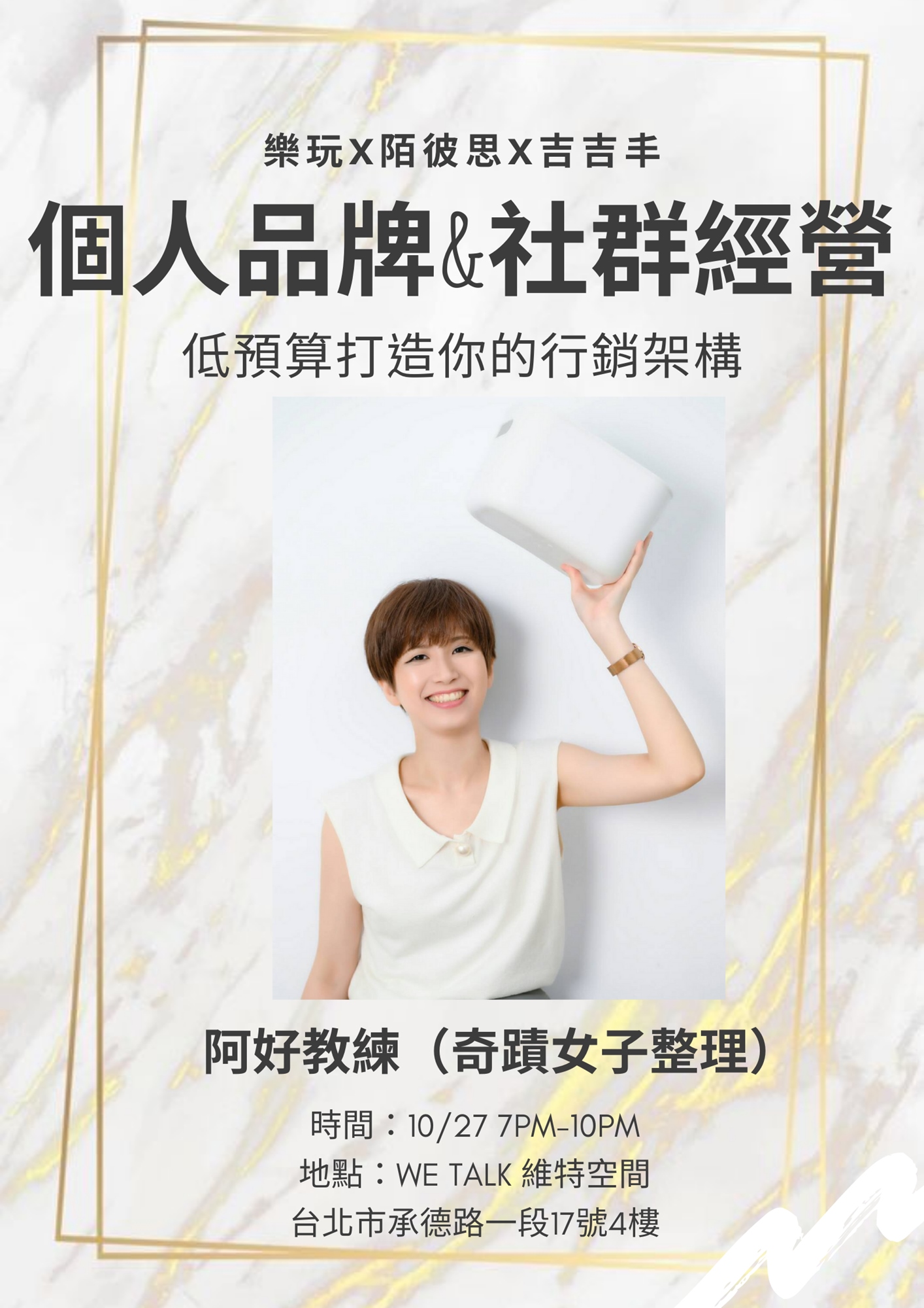 阿好教練原本也是一位普通的上班族,在市場中找到貼近生活的藍海,在整理師這個新興產業,2年內創造8000粉絲、30000以上觸及! 她有豐富的行銷經驗、品店舖營運銷售、以及行銷企劃的經驗。因此,我們邀請她在10/27星期二晚上來分享「個人品牌 & 社群經營」的實戰技巧!