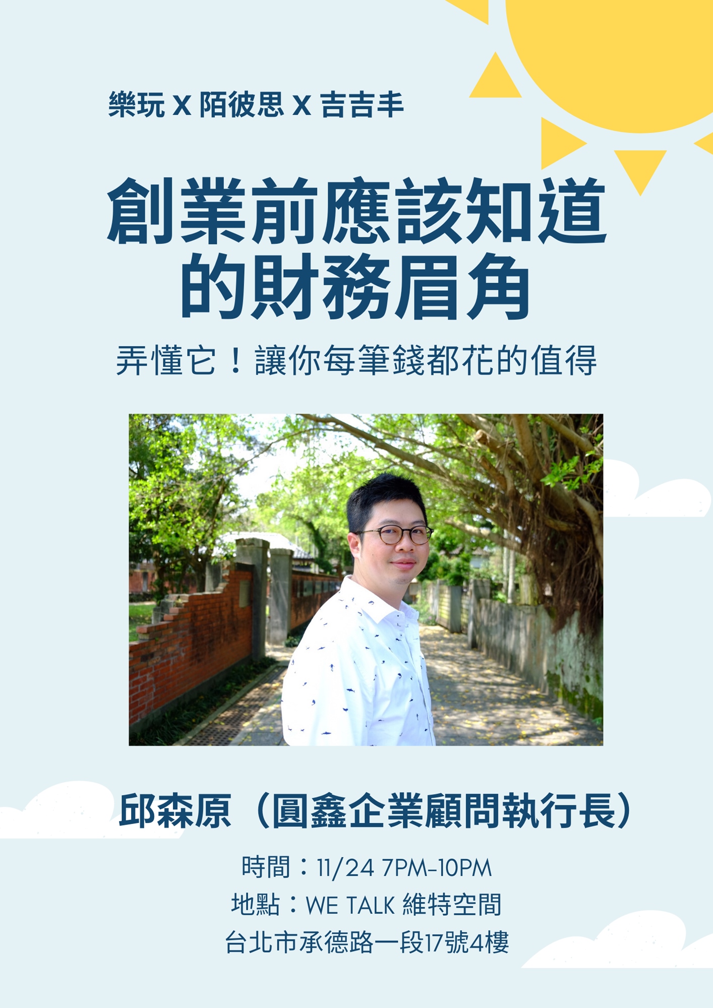 我們聽到大家的心聲了!因此,我們邀請到橫跨各種產業、有豐富輔導創業團隊經驗的邱森原顧問執行長,在11/24星期二晚上,用過去在北市政府產發局、勞動力發展署的深厚內力,幫大家「金金計較」,發揮最大價值!