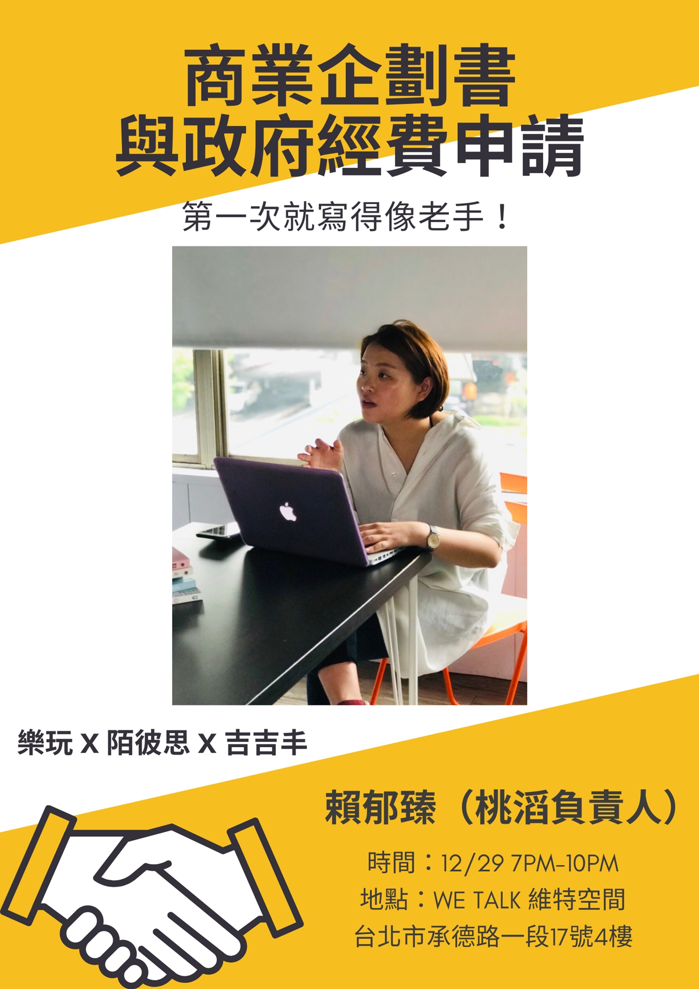 活動將分享如何實際撰寫政府補助,及如何盤點現有資源,設計一個好的企劃,讓不同領域的人,能一起加入你的行列,如何創造1+1 大於2的效益。本次活動將以實際計畫書為例,分享政府補助計畫與商業企劃撰寫技巧!