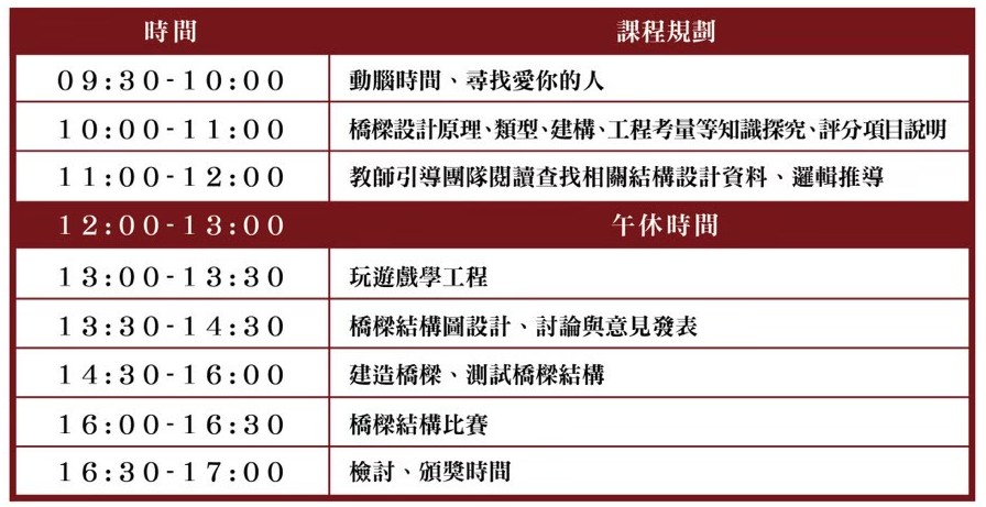 透過實作以及遊戲的方式建構學生建築設計、橋樑建造知識,並跨數學、工程、藝術、科學等素養,學習如何設計橋樑結構、了解橋樑結構背後的物理原理以及幾何知識,讓結構力學不再是硬梆梆的學科!並藉由講師引導,讓學生自行闡釋設計橋樑背後的數學和物理幾何原理為何,最終透過團隊橋樑結構競賽的方式,讓同學互助合作,合力實作完成結構作品,一天的營隊便能帶給你滿滿的建築知識與樂趣!