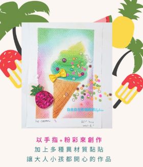 ※體會粉彩上色技巧、畫面動線呈現,親子共同創意發想,加上喜愛的珠珠和 亮粉裝飾冰淇淋,再選擇喜愛色系上色完成作品,作品可愛又漂亮。