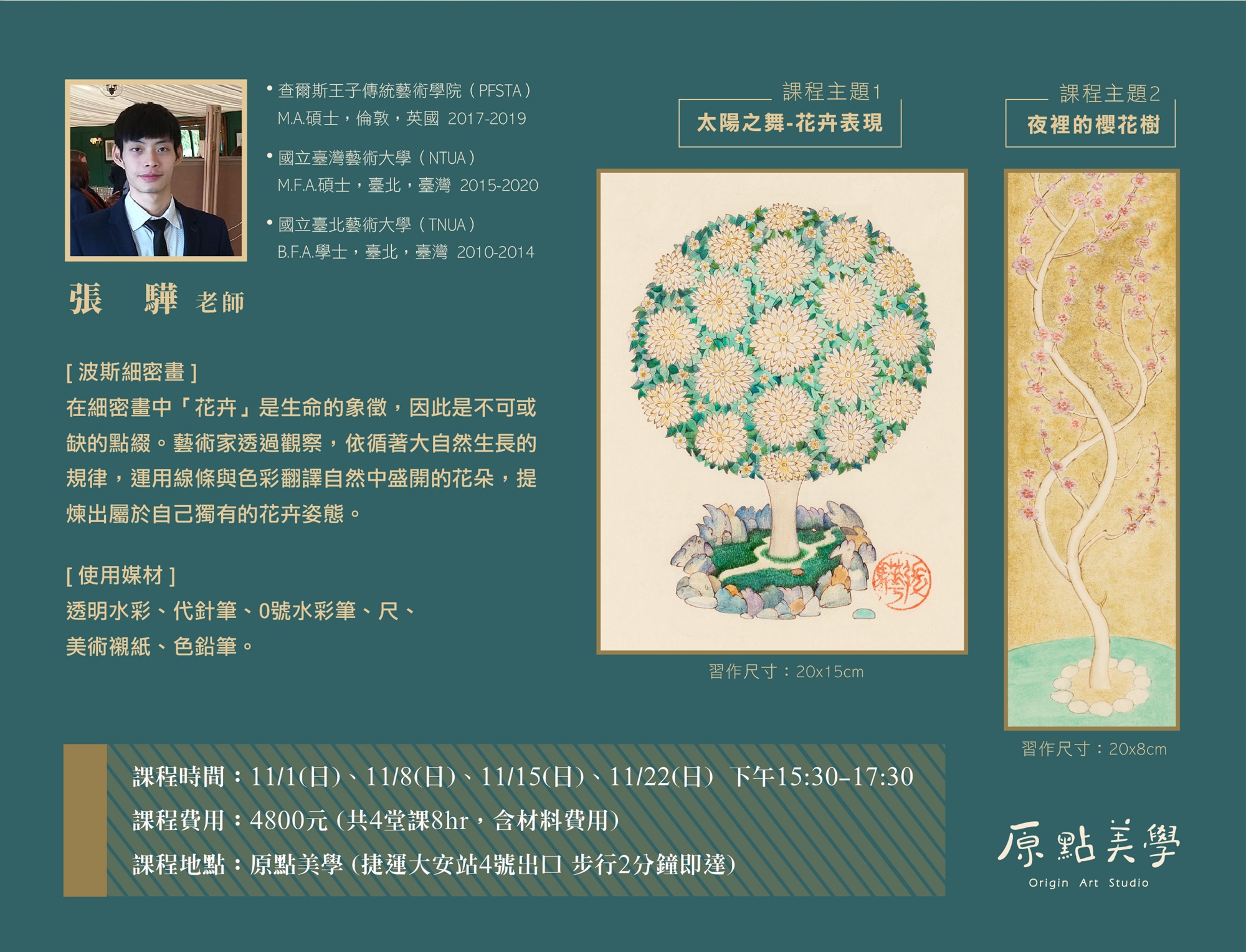 在細密畫中「花卉」是生命的象徵,因此是不可或缺的點綴。藝術家透過觀察,依循著大自然生長的規律,運用線條與色彩翻譯自然中盛開的花朵,提煉出屬於自己獨有的花卉姿態。張 驊