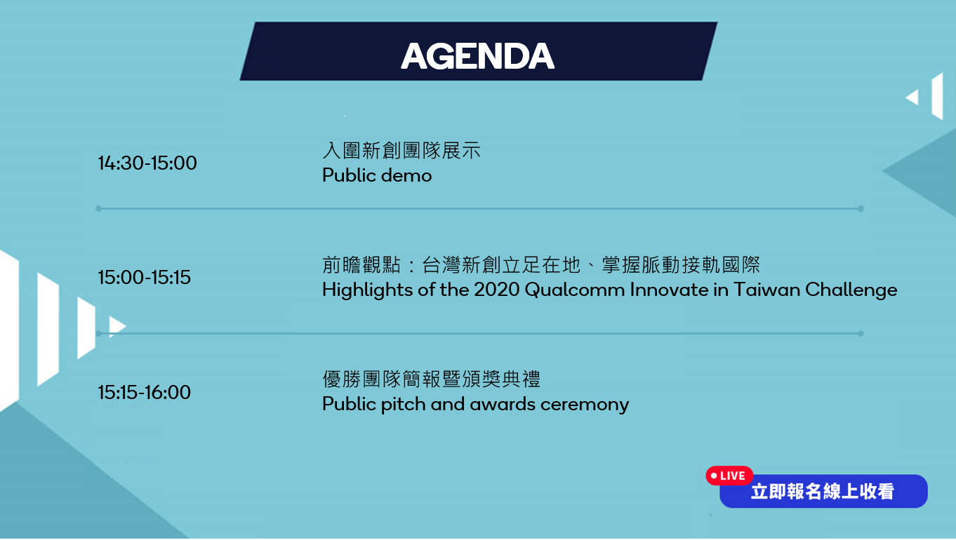 2020年「高通台灣創新競賽」由運用5G、蜂巢式物聯網、機器學習等科技,以開發XR、智慧農業、智慧醫療、智慧工業、智慧城市等相關應用為主的10支新創團隊獲選,經過為期六個月的育成計畫,將於11月11日台灣時間14:30在直播中揭曉決賽結果,10家入圍優秀新創團隊公開Demo,一次快速了解團隊亮點,3家新創團隊最終贏家Pitch,展現脫穎而出的決勝關鍵!