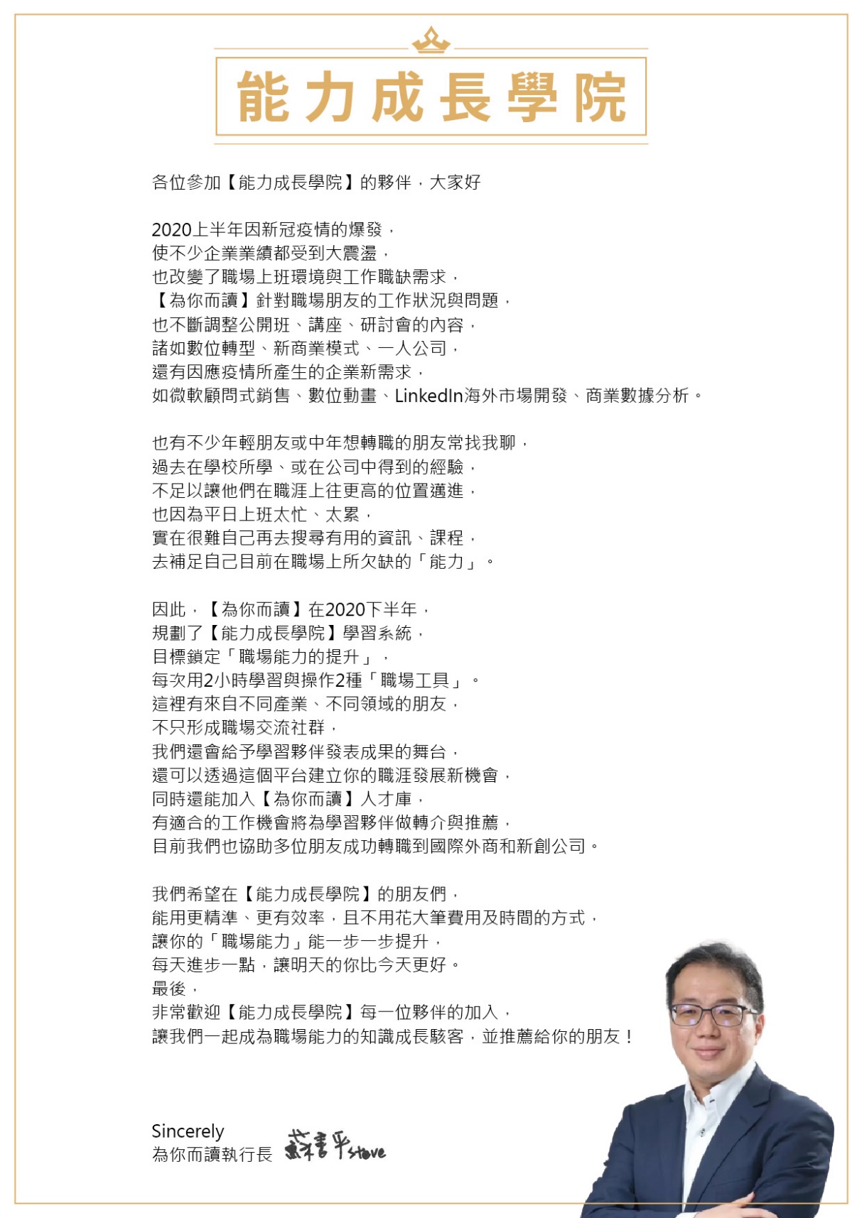 ▍什麼是能力成長學院? ─從趨勢找到你的職場優勢,設計出你的專屬對策 ─轉職/晉升/競業競爭皆適用,你的職場能力教練 不論是身處於國內或國外的職場,如今的新世代人才,除了專業與技能的提升外,更講究的是「能力成長」,這包含了解決問題、提出方案、專案管理等層面。 「能力成長學院」,即以「培育台灣新世代人才,成為知識的成長駭客」為宗旨,讓學員們每個月學習不同領域「能力UP」知識內容,帶你快速進行知識迭代,職場能力大躍進,成就更好的自己! |
