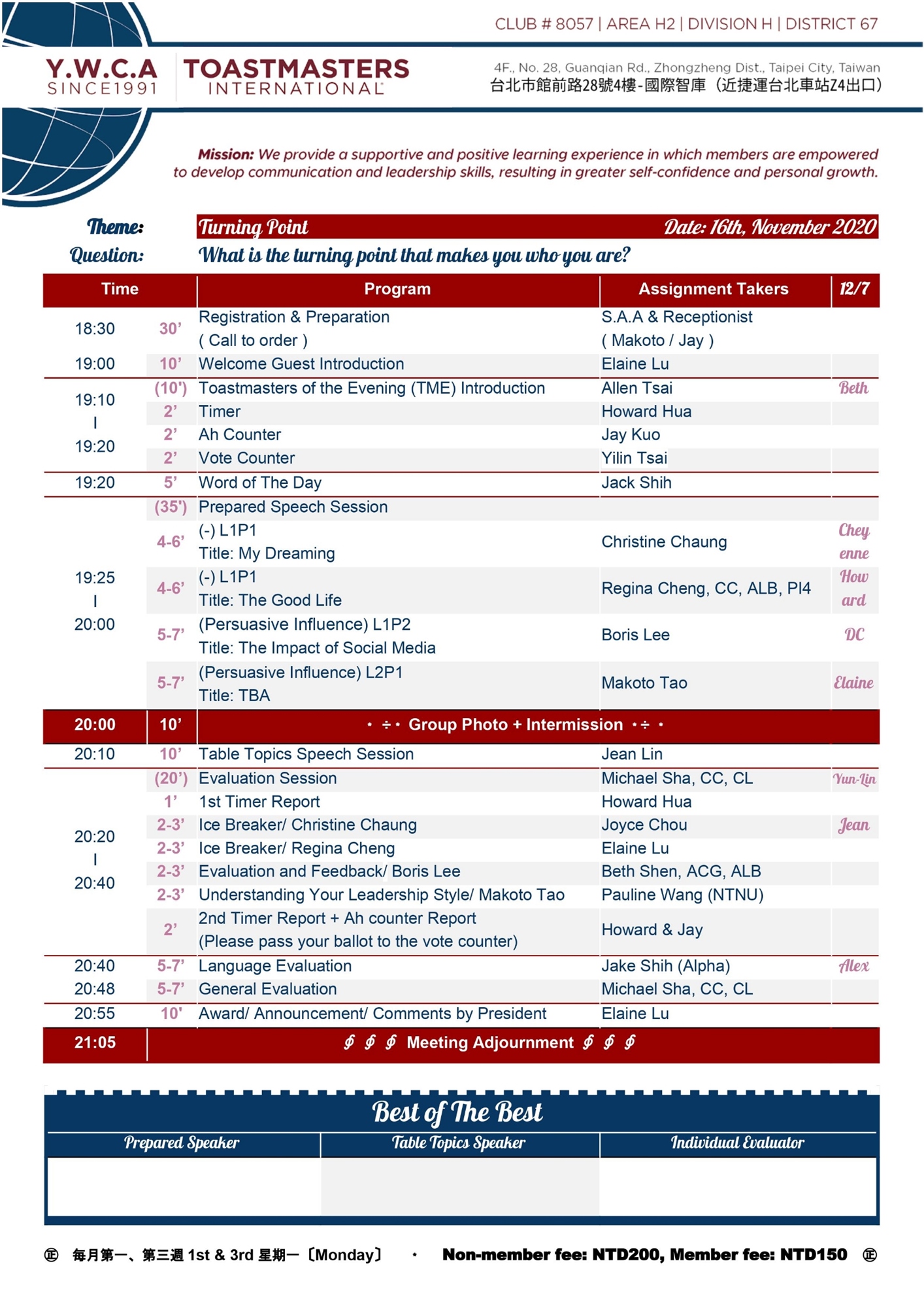 嗨,大家晚安,距離2020年底剩不到50天了!大家今年過的還好嗎? 我們的例會將在11/16(一) 舉辦。歡迎參加我們的例會,讓我們一同聽聽大家的故事,同時增進領導力及口說能力一同到年底吧!
