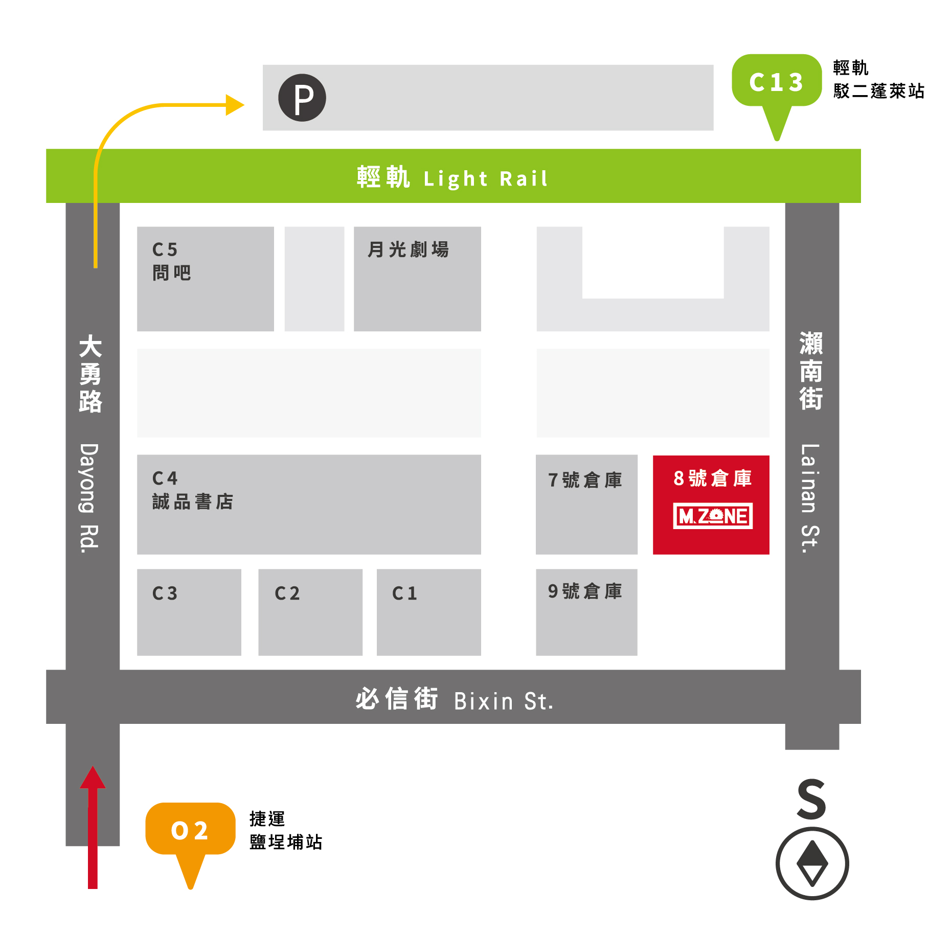 輕軌:駁二蓬萊站(C13站),步行約1分鐘。