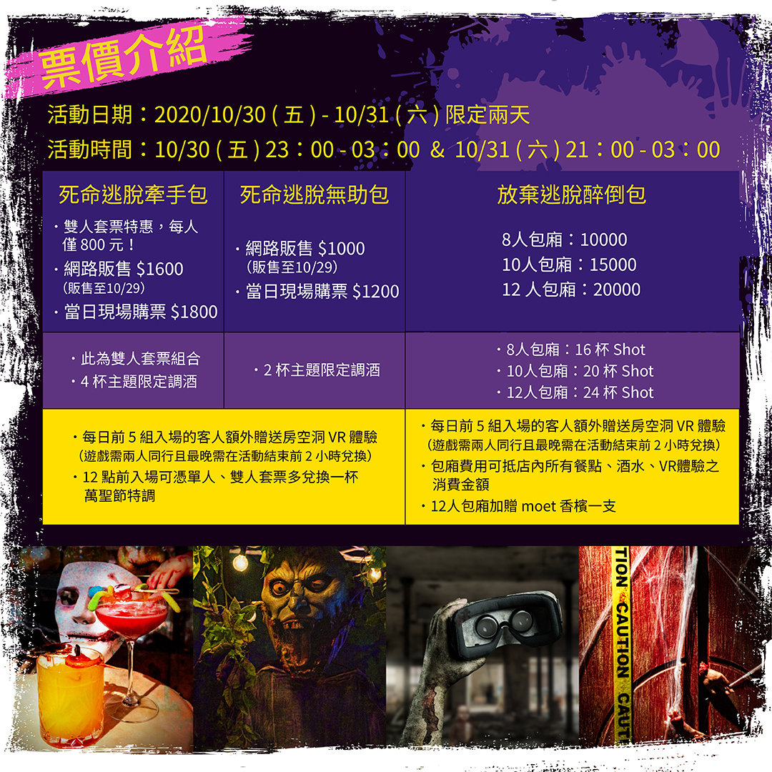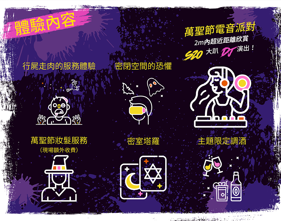 台北東區佔地百坪餐酒館,結合時尚電音派對、火辣性感的知名DJ、鬼屋主題VR密室逃脫,帶給您難忘又驚奇的恐怖萬聖夜!