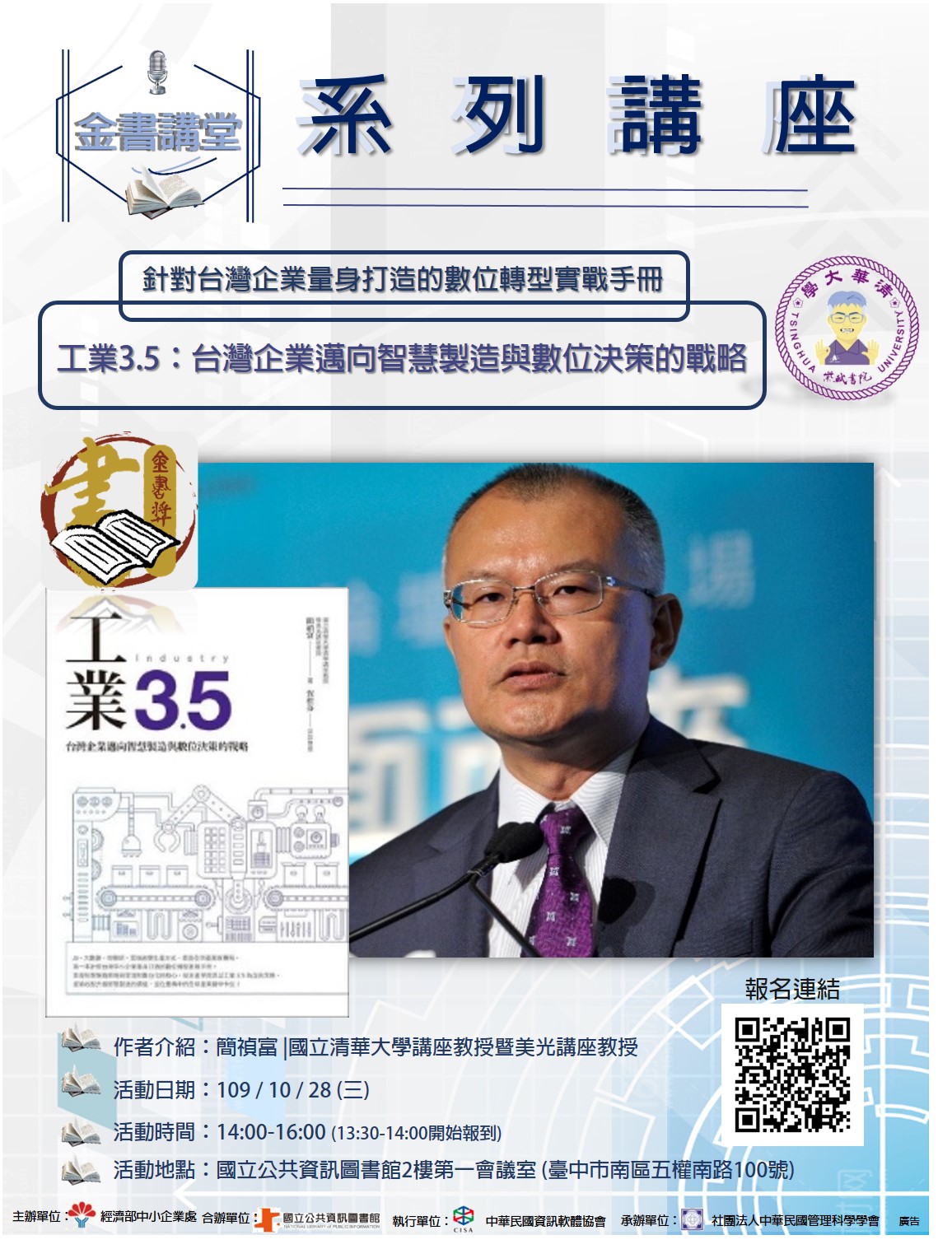 為進一步擴散推廣成效並帶動國內閱讀風氣,今年將於10月下旬至11月上旬結合國家圖書館、國立公共資訊圖書館、高雄市立圖書館(左新分館) 合作辦理「金書講堂」系列推廣活動3場次(全程免費!!),且特邀約本年度榮獲金書獎項之作者來到活動現場,與民眾一同咀嚼書中內容,歡迎中小企業業主及社會大眾一同參與閱讀的知識饗宴,希望藉由輕鬆導讀方式,傳遞國內外管理新知。