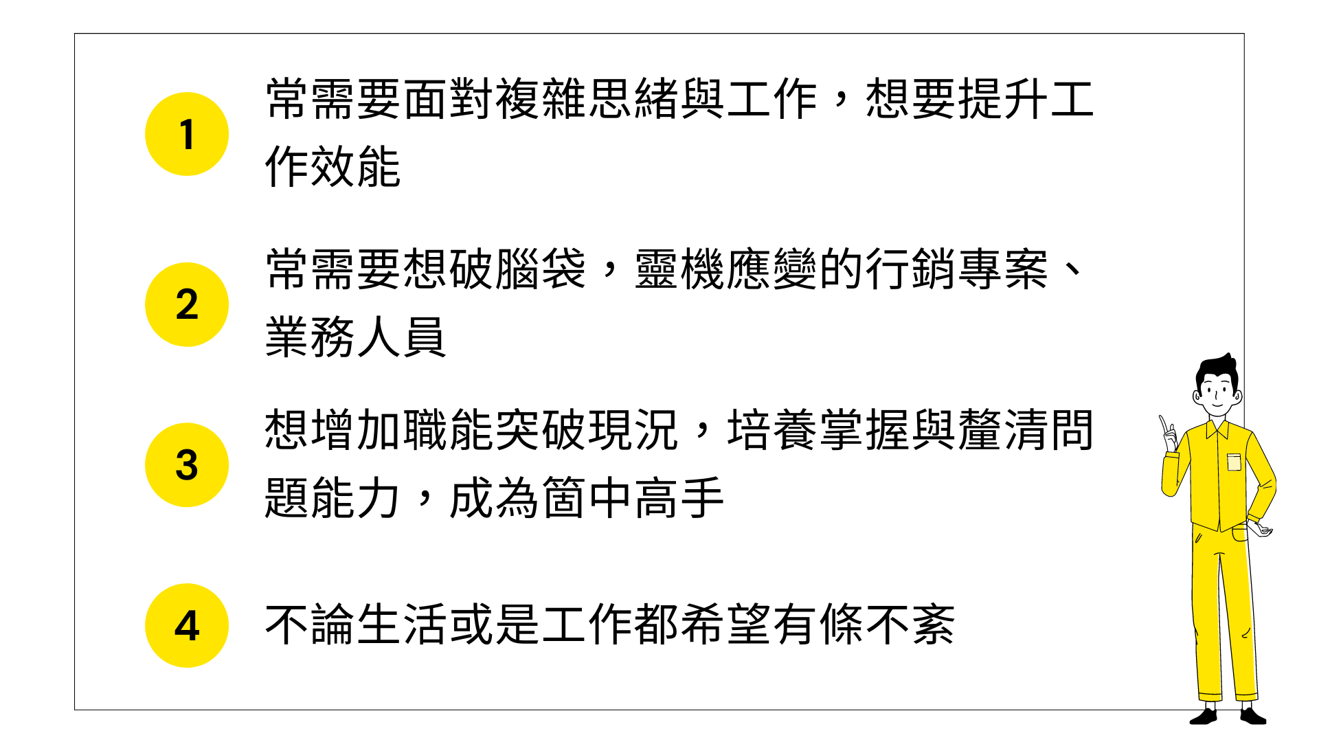 不僅能用在工作、職場中,也能應用在筆記、創意激盪、人際關係上,幫助你快速理清、盤整思緒,掌握問題更清晰!