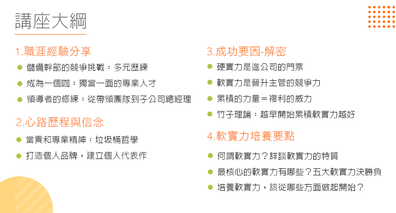 在這場演講中,他將分享自己從基層到領導管理者的實務經驗,並透過提問引導你思考,讓你可以有計畫地養成軟實力,而軟實力就是您的晉升力!