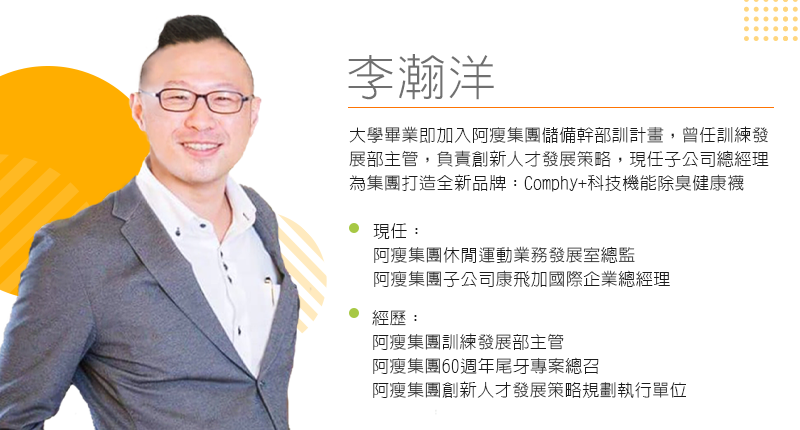 大學畢業後即進入阿瘦集團第五期儲備幹部計畫,經歷門市實習、實戰報告、專案任務、部門輪調、外派歷練等多元挑戰,成為能獨當一面的專業經理人,再到帶領團隊的領導管理者,最後成為子公司的總經理。