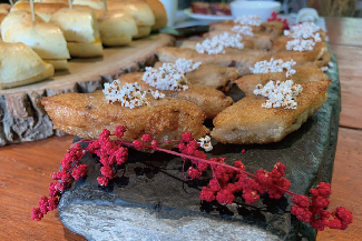 紅藜加紅豆,炸出金黃酥脆的糕點,再撒上超級食物油芒,創新料理「藜藜糕」上桌。