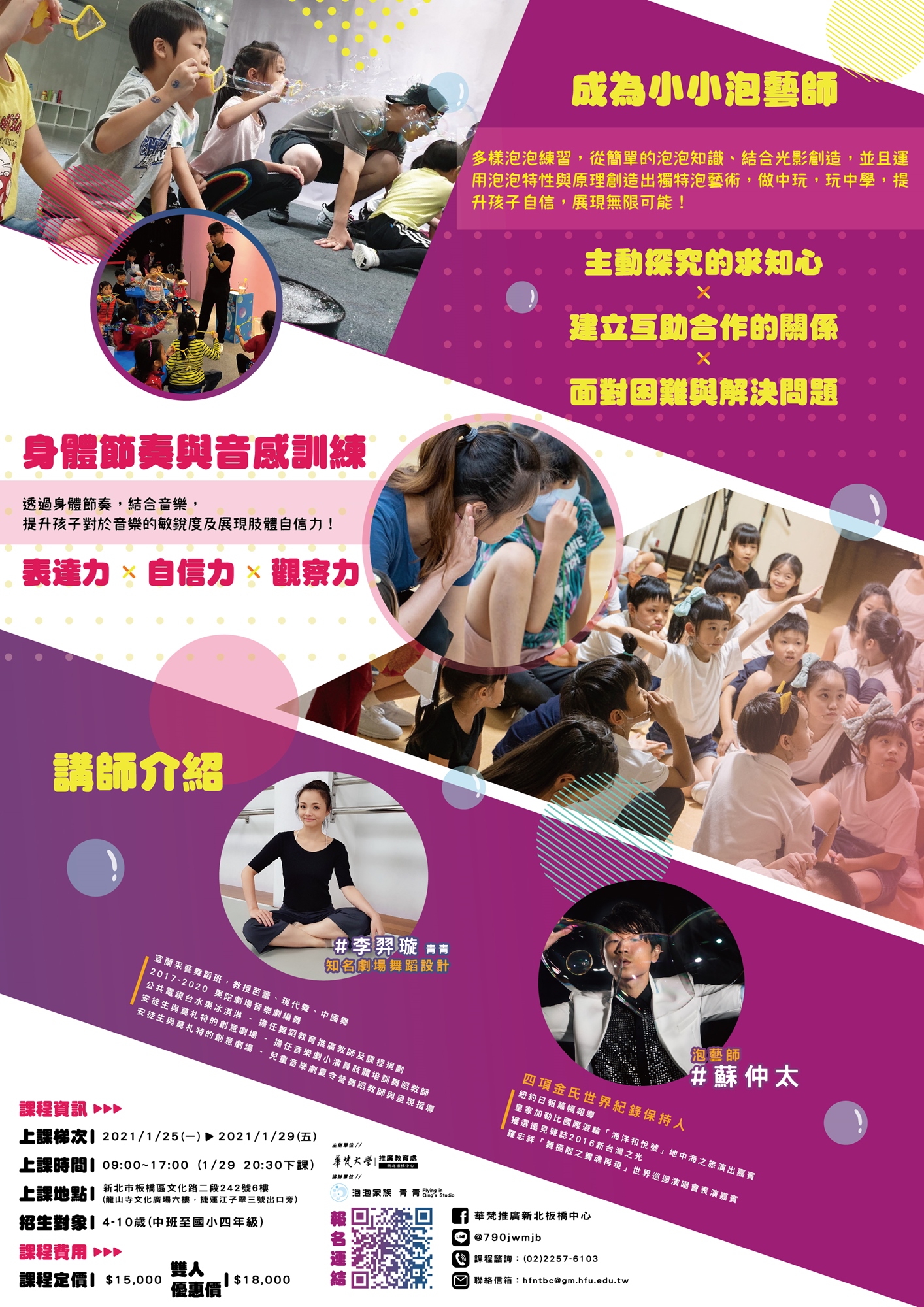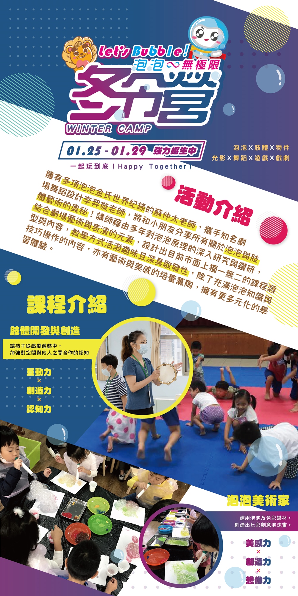 A3:可以的。本課程的目的,是讓孩子從課程中,認識泡泡表演的方式。泡泡對孩子來說,不只是遊樂的一種工具,在表演藝術的領域中,泡泡有各種呈現的方式。因此,本課程是讓孩子藉由泡泡與肢體的共同呈現中,認識表演與藝術。
