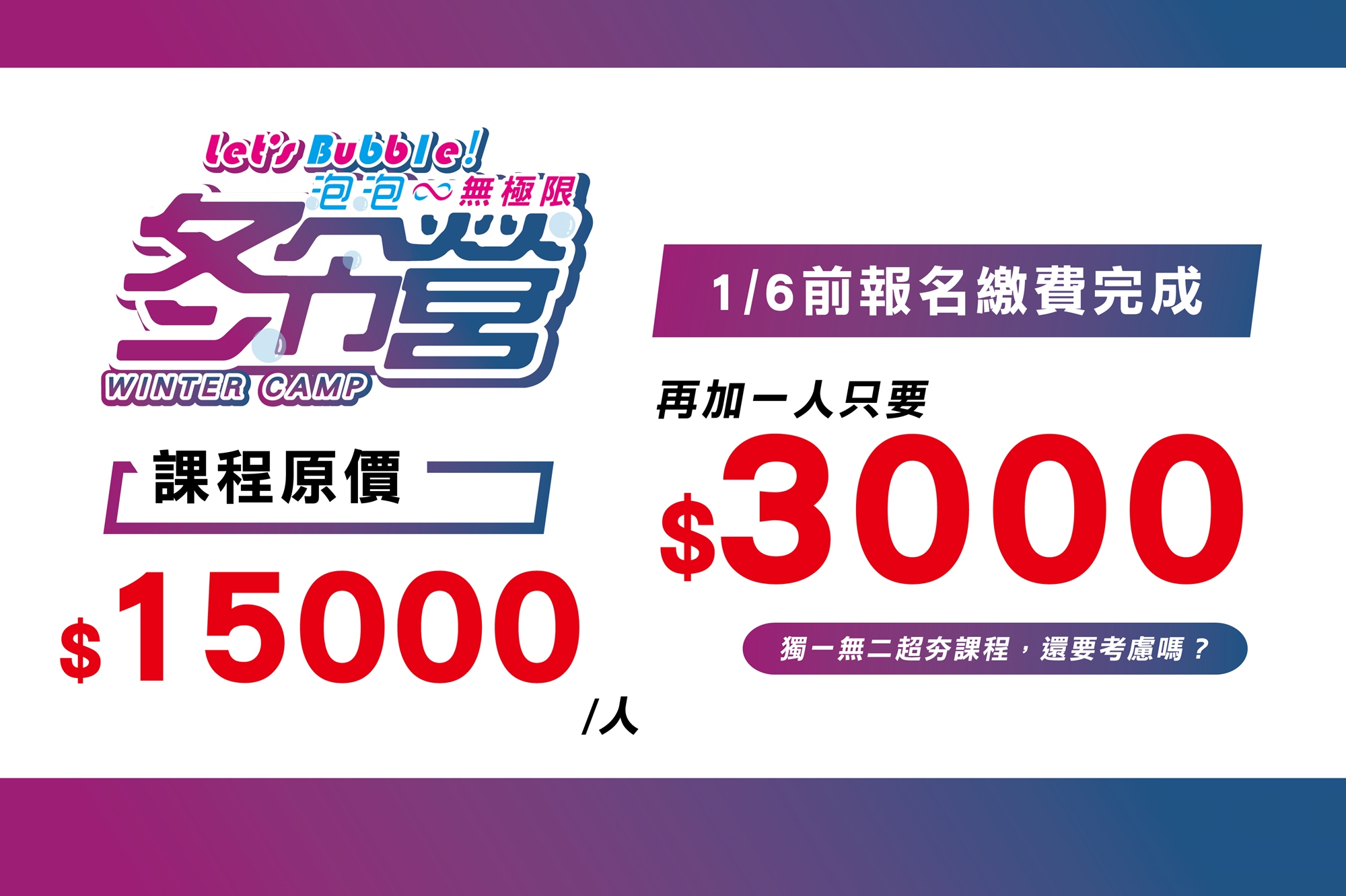雙人團報優惠:$9,000元/人 (即日起至110/1/6 23:59截止報名)