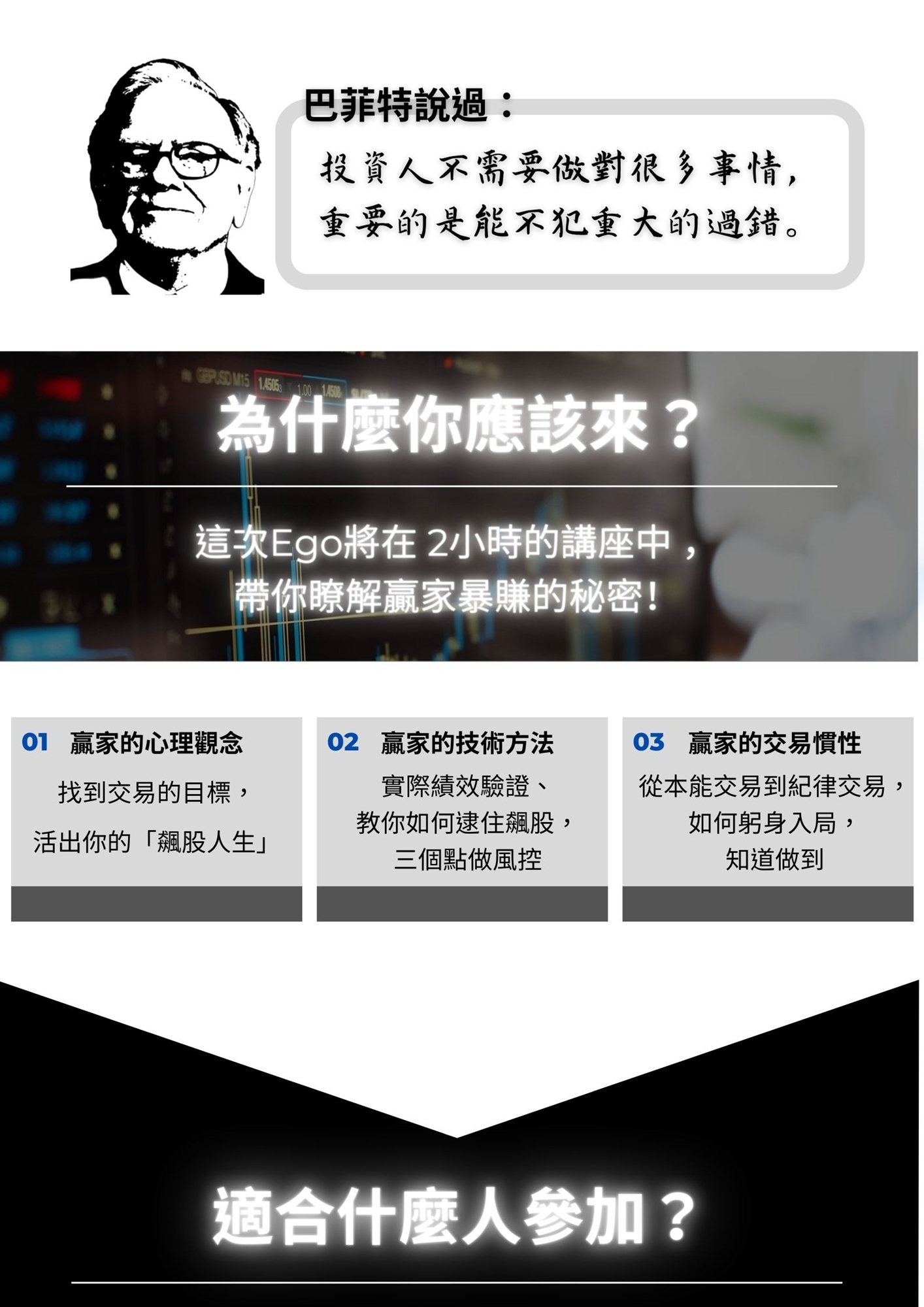 【11/9台中】EGO風控獲利講座帶你逮到飆股,超過100%的報酬率!