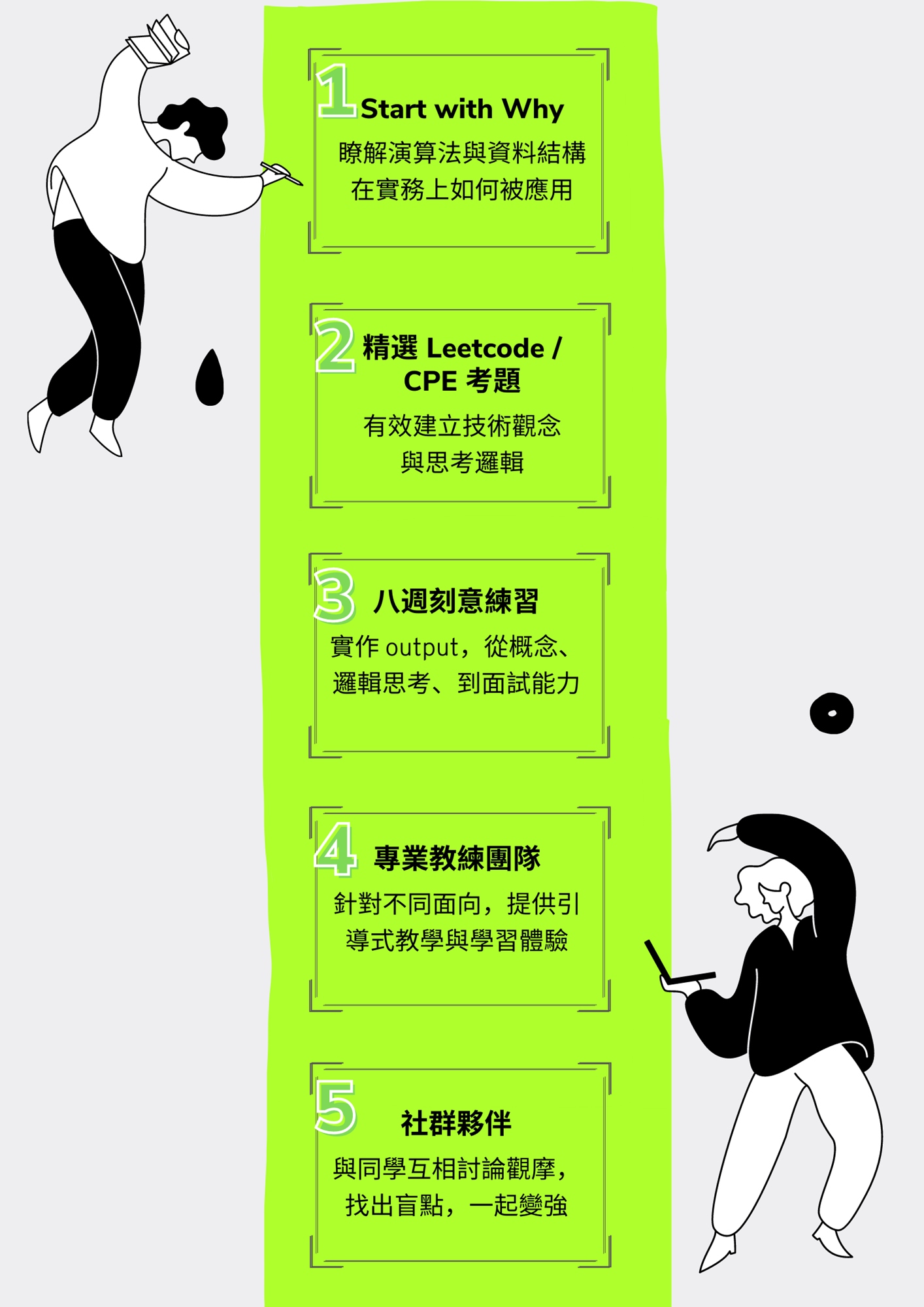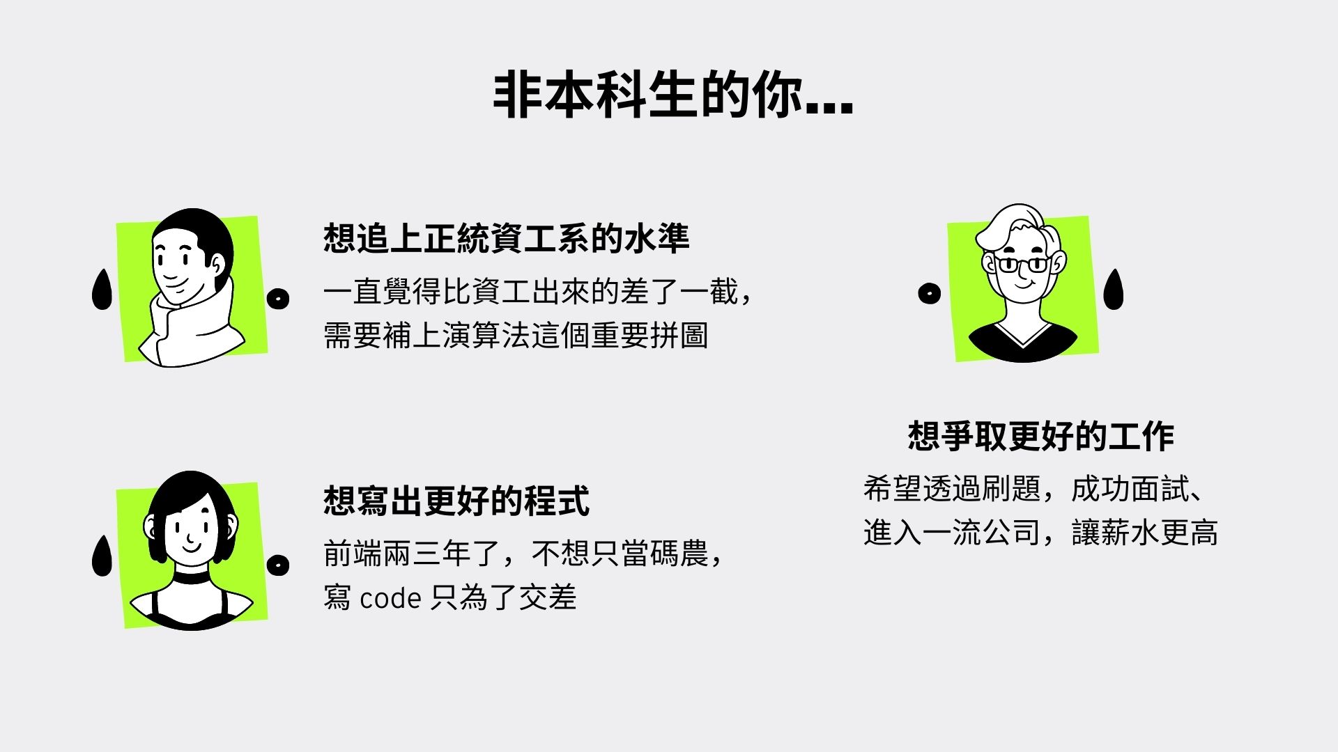 🏋️♂️ 基礎教學|非本科的你,不用再擔心自己學習的內容是否足夠。我們有來自台大、清大、交大、以及 MIT 資工系科班畢業,並附有高度教學經驗與熱忱的教學助教,將循序漸進的帶你進入 Leetcode/演算法的世界。
