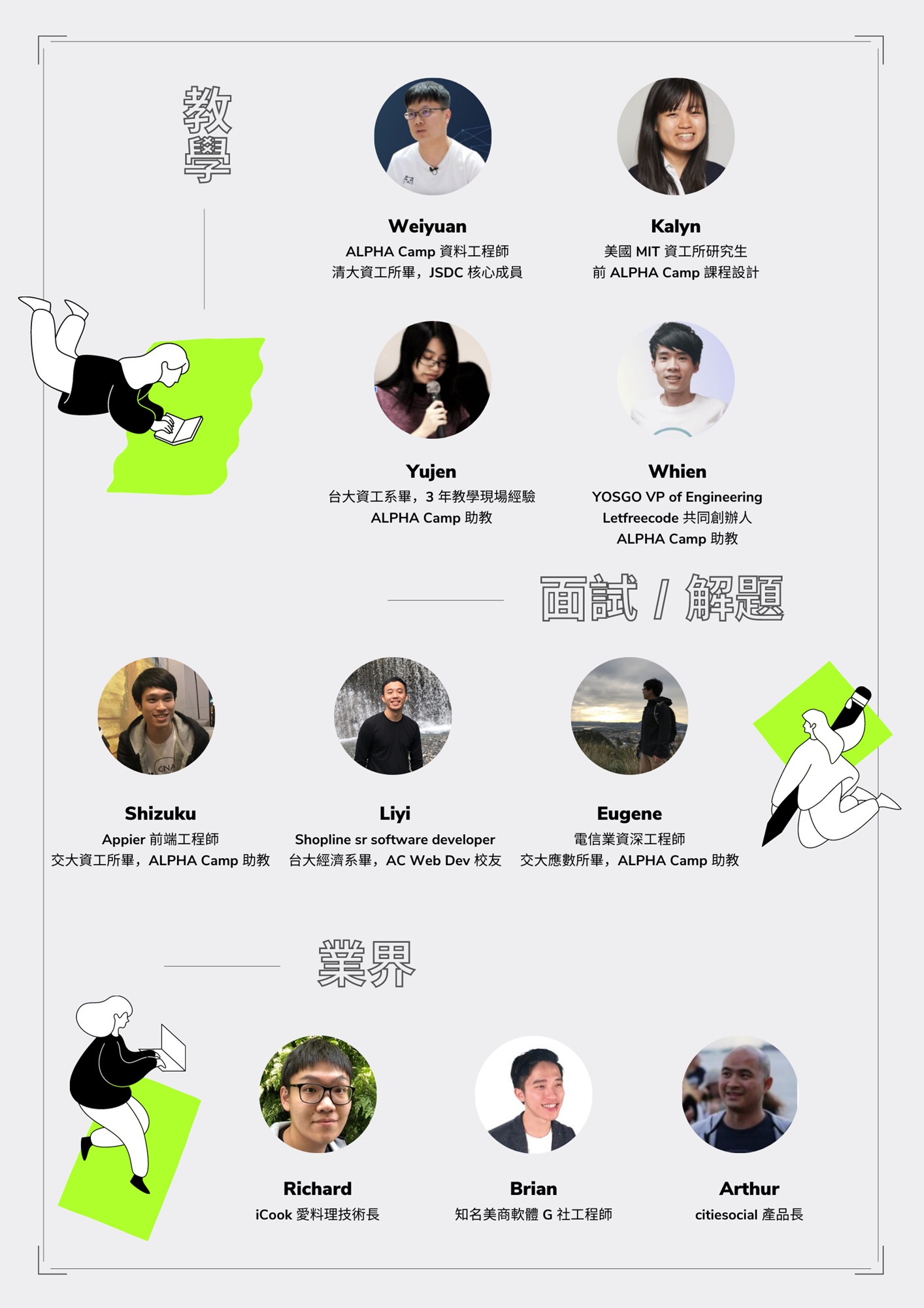 針對上述三個不同學習面向,ALPHA Camp 邀請到強大的講師與助教團隊,有來自台大、清大、交大、MIT 資工系所畢的講師、實戰經驗豐富 FAANG、Appier、Shopline 的工程師,以及業界技術長、產品長,提供最針對性的學習輔導。