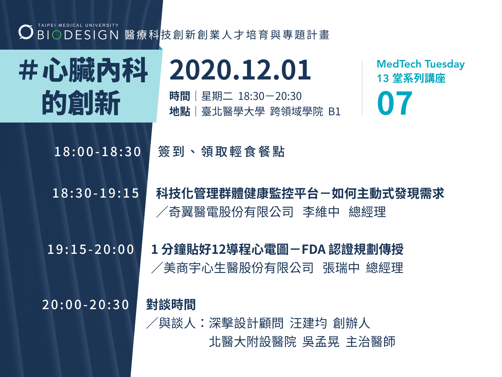 臺北醫學大學創新創業教育中心X北醫體系一校三院,共同推出【MedTech Tuesday 醫療科技產業 13 堂系列講座】,本堂講座邀請心臟內科疾病的創業家,分享創新創業過程如何因地制宜規劃商業模式!