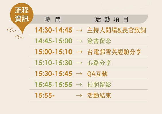 活動現場的最大亮點,就是邀請在台電配售電系統工作的資深或退休員工,透過他們的工作分享,彰顯台電薪火相傳,永不斷電的企業精神。並有Q&A時間讓參與者提問,凡是參與問答皆可獲贈限量禮品1份,邀請對台電歷史及配電系統有興趣的您一同參與。