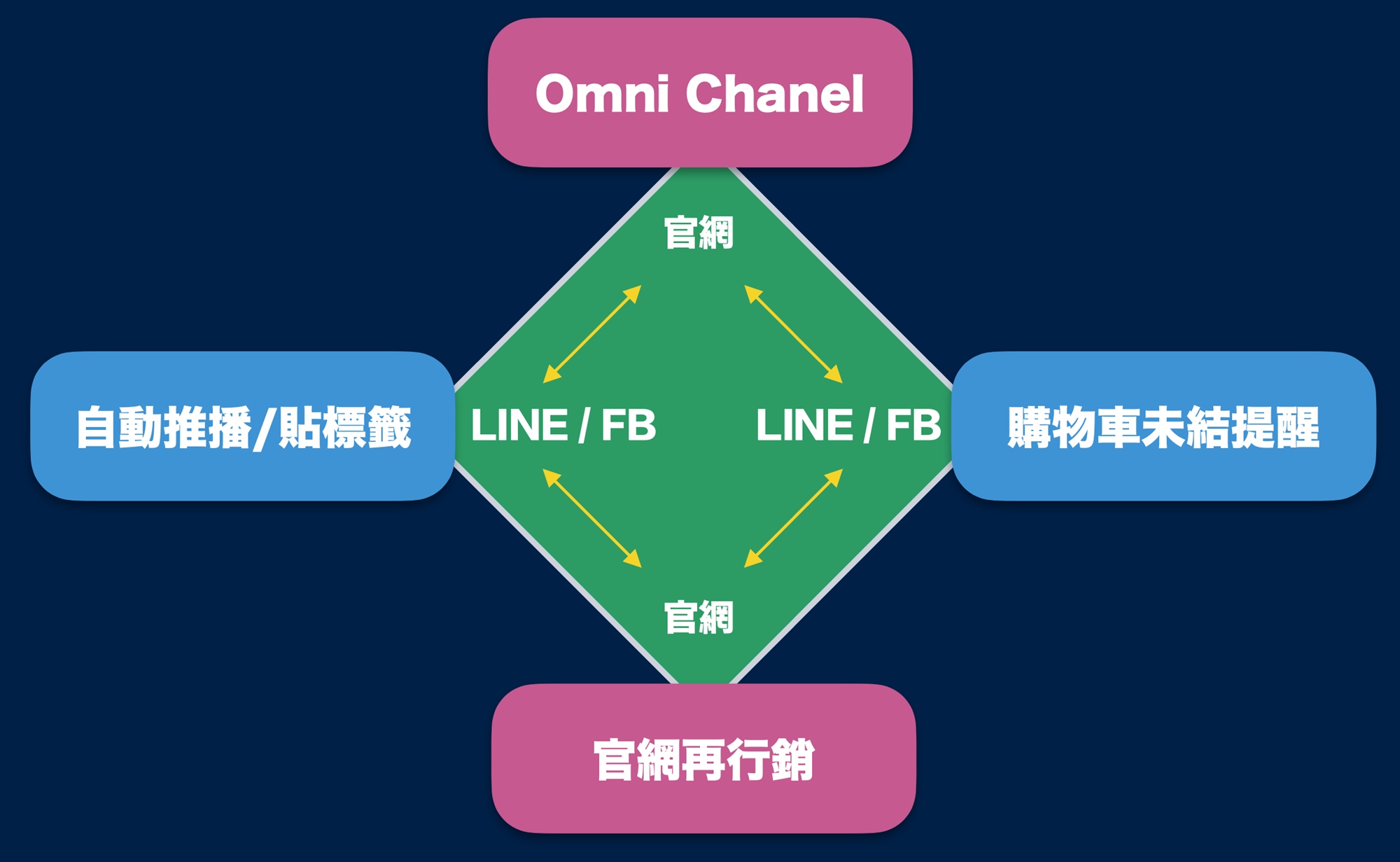 但現在 Insider 和 Omnichat 彙整每一位客人的 LINE / FB / Email / IG(即將釋出),從官網購物時自動觸發行銷訊息,到客人離站後由各渠道把客人帶回購物車結帳,甚至未來根據客人興趣標籤/購物習慣,主動推播優惠給特定顧客,培養客人成為品牌忠實粉絲。