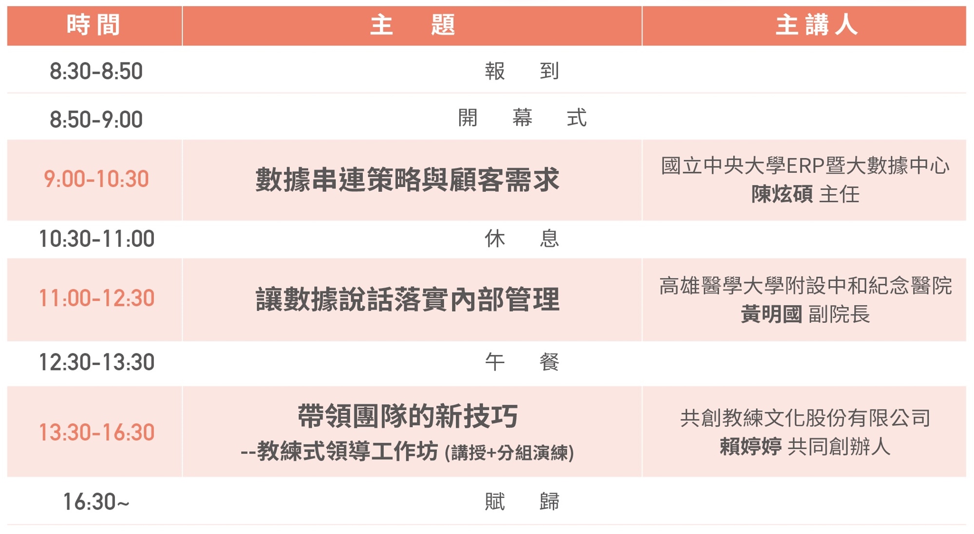 本場培訓以演講結合實作的形式,帶領主管們從機構或單位經營的層次,以績效為主軸的流程,輔以課堂上的實作,啟發醫院主管們對於數據與教練的開闊性思維,為醫院創造提升醫療與照護效率之價值!