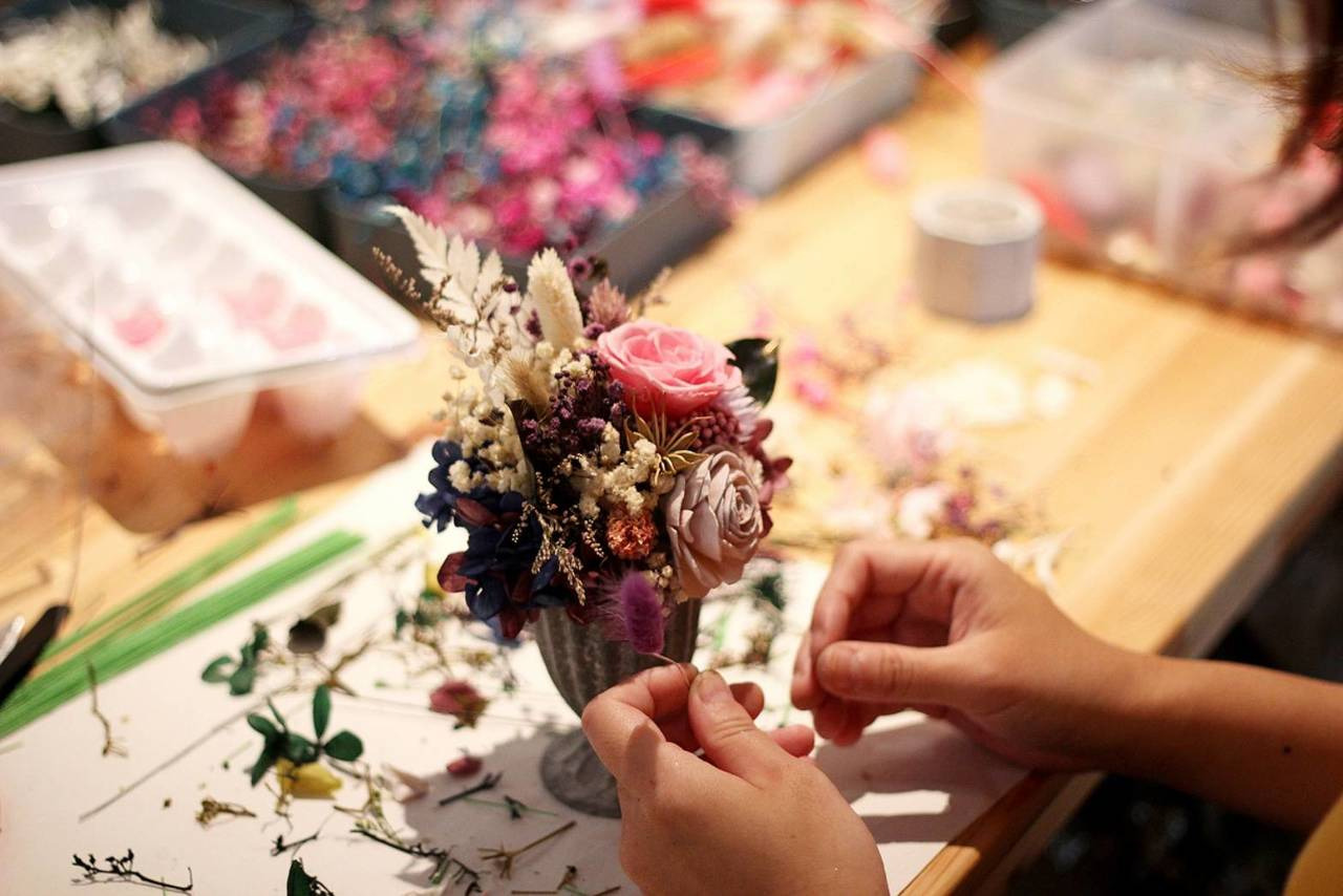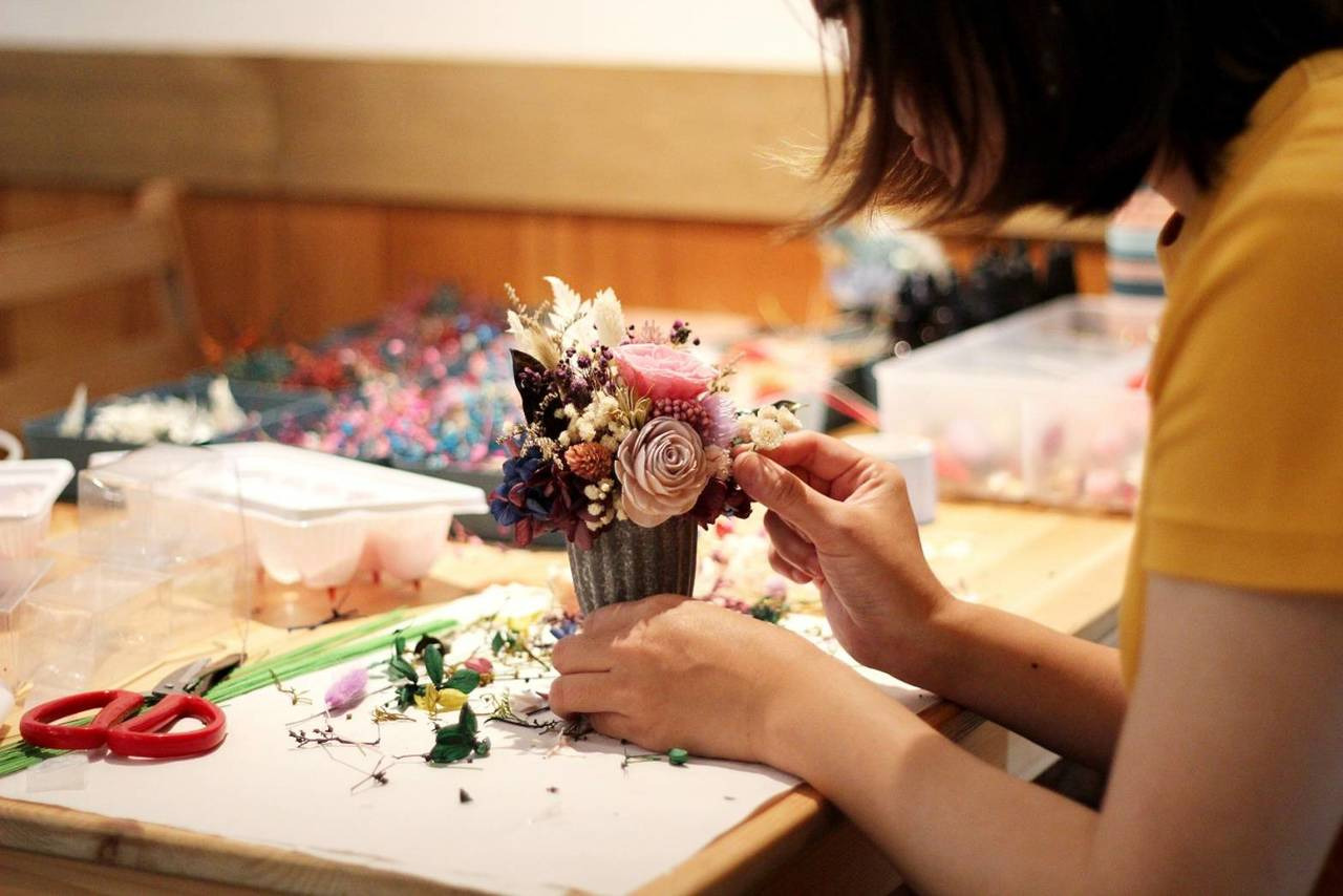 一開始需要去挑選自己喜歡的花材,在心中構圖和配色,挑選主花與相對應的位置擺定後,逐漸將襯花配置其中,創造出不同顏色與花材交錯堆疊的美。