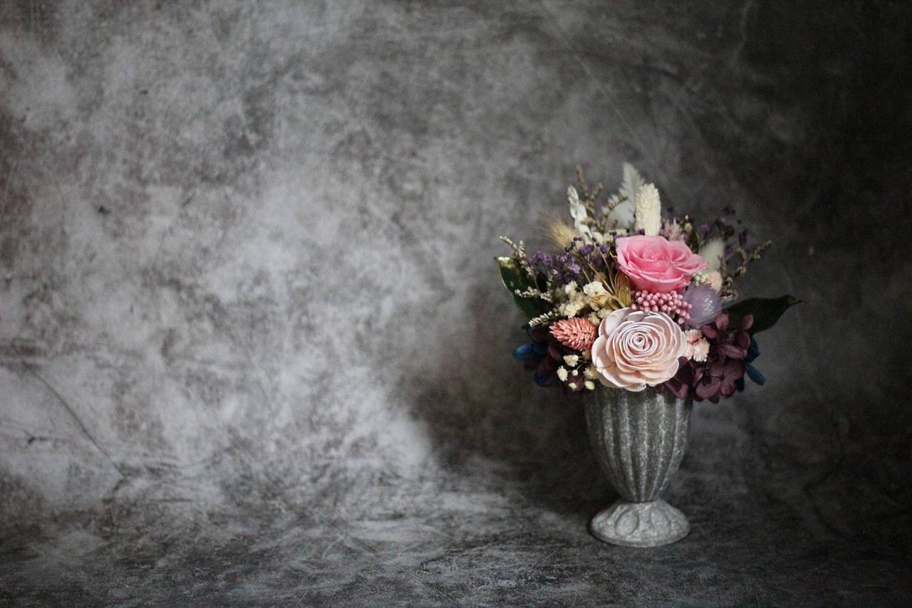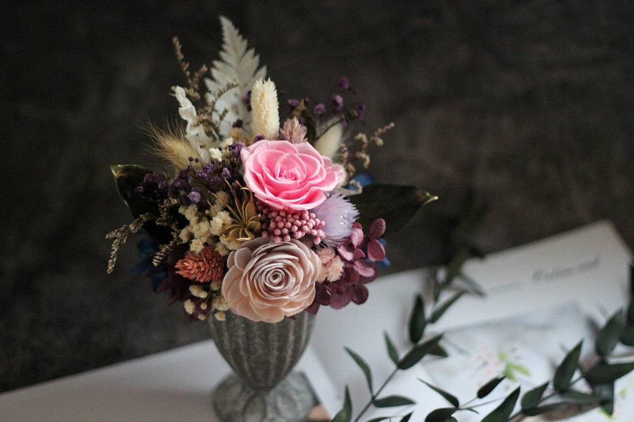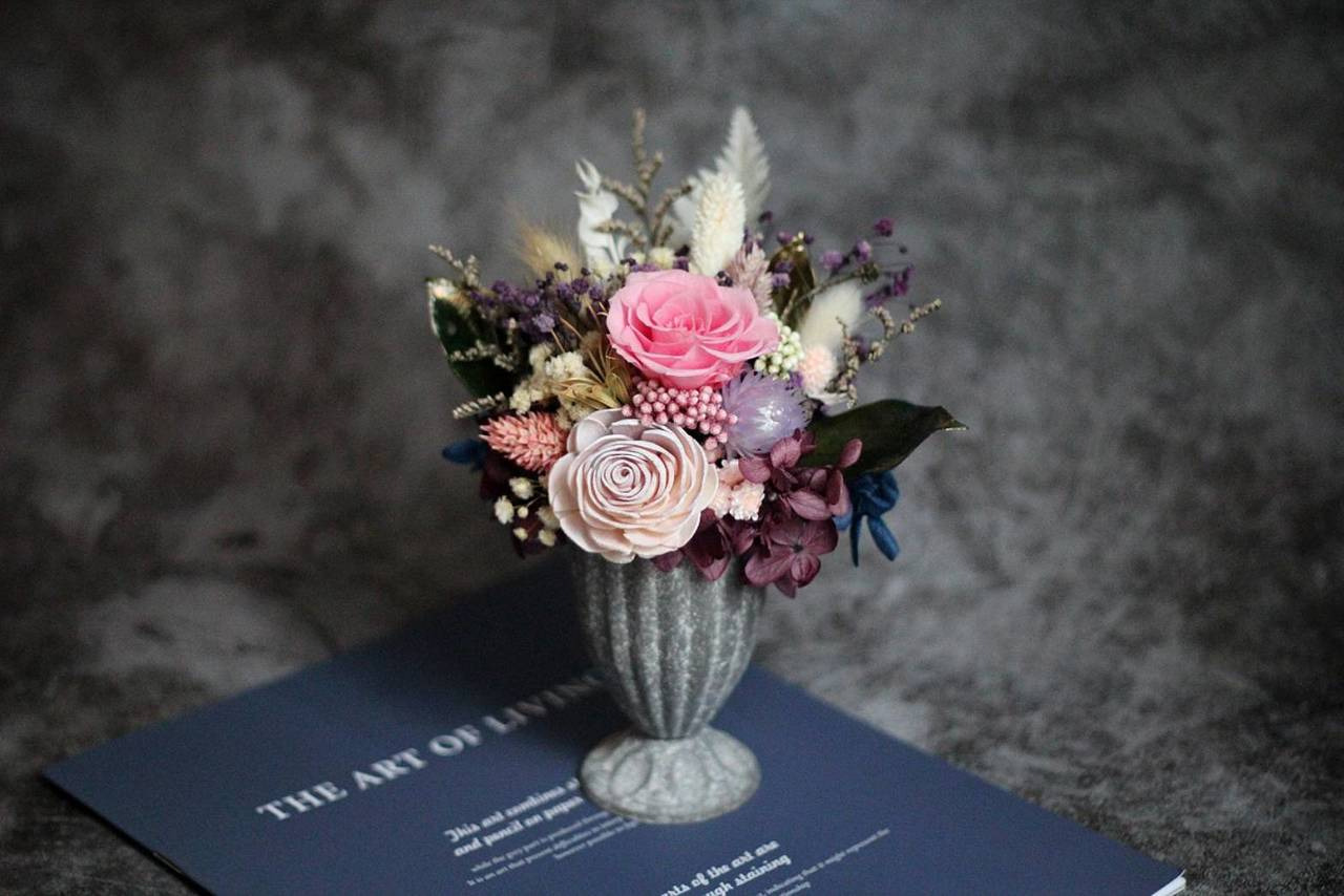 巴洛克永生玫瑰花盆,成品會讓自己很有成就感,搭配著玫瑰花,索拉花,繡球花,不同花材相互配置,配上石材外表的花盆,擺在桌上,彷彿回到16世紀法國宮廷的晚宴。