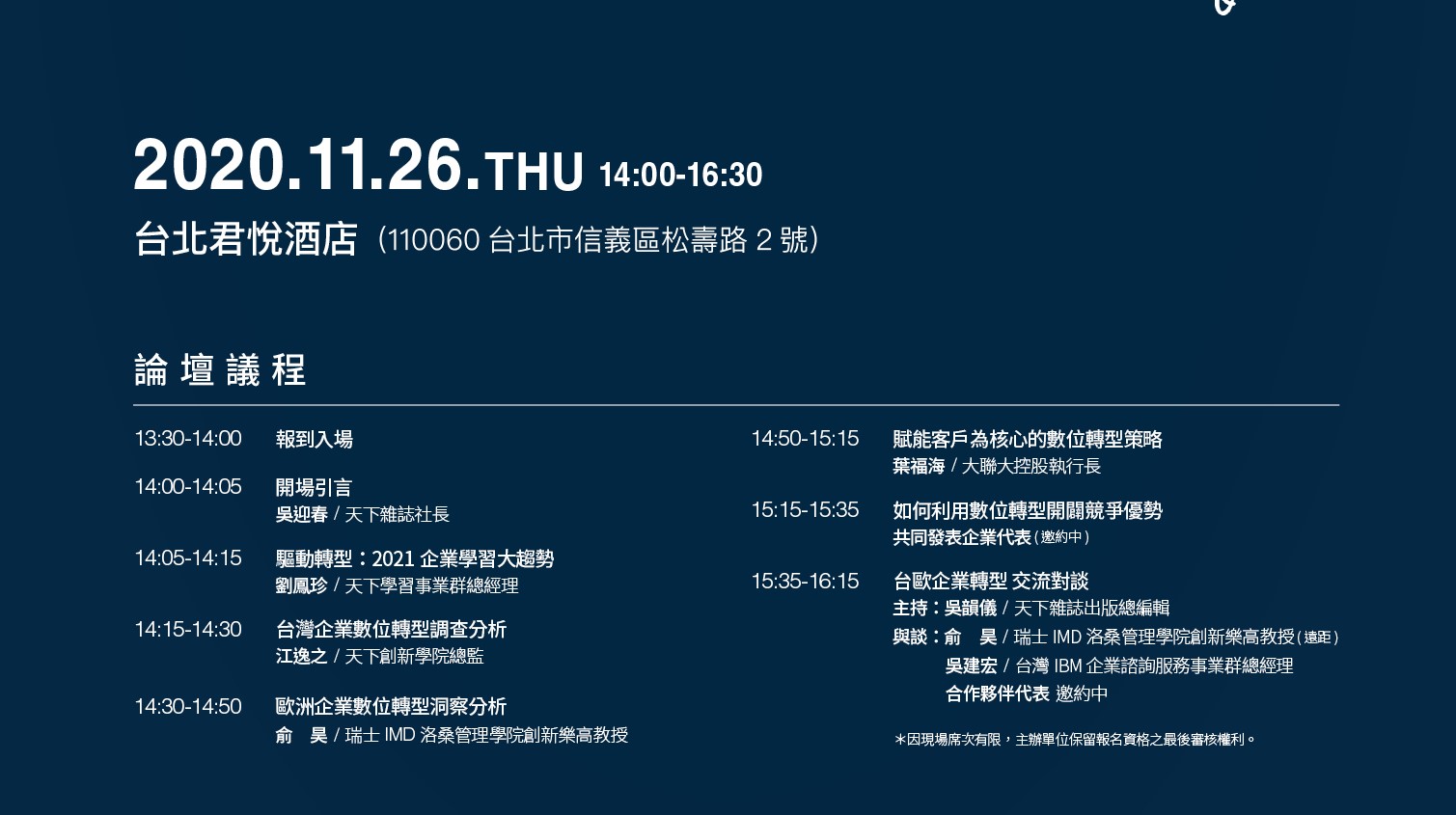 本次論壇我們將發佈2020年全球第一份台歐企業的跨國數位轉型大調查,調查台歐企業在COVID-19疫情下的企業營運與數位轉型的衝擊 ,現場邀集各產業領域的專家學者,分析東西方的企業數位轉型現況,針對數位轉型的策略規劃、執行狀況、成熟度與人才發展等面向,從學術知識的全觀思維、轉型現場的火線參與,以及實務經營的推動歷程,深度剖析台灣企業數位轉型當前的困境與契機!