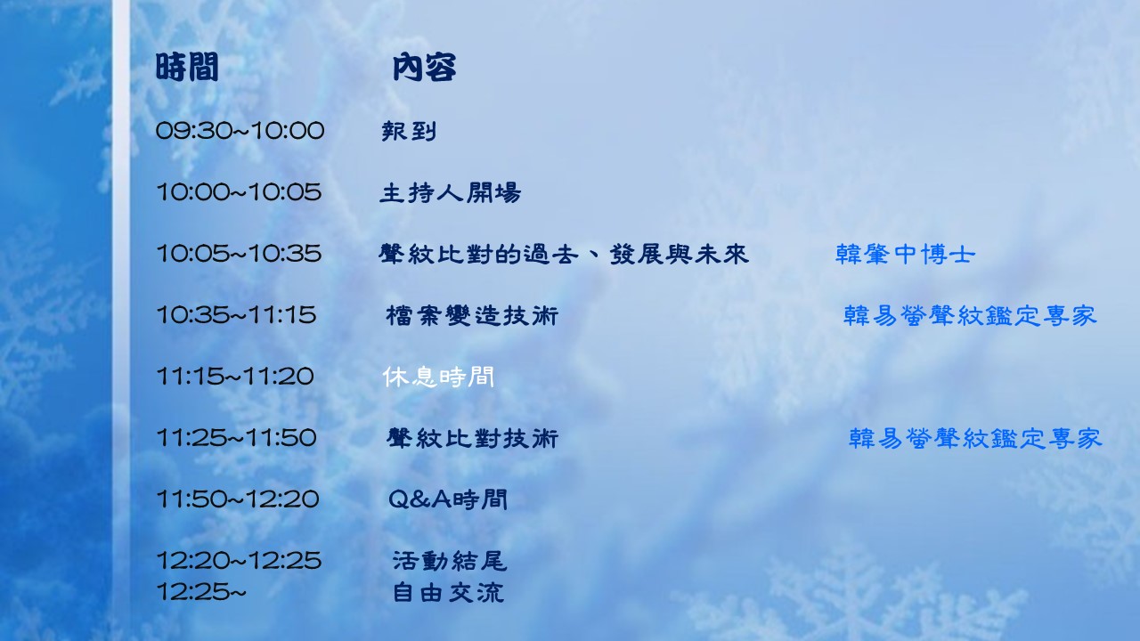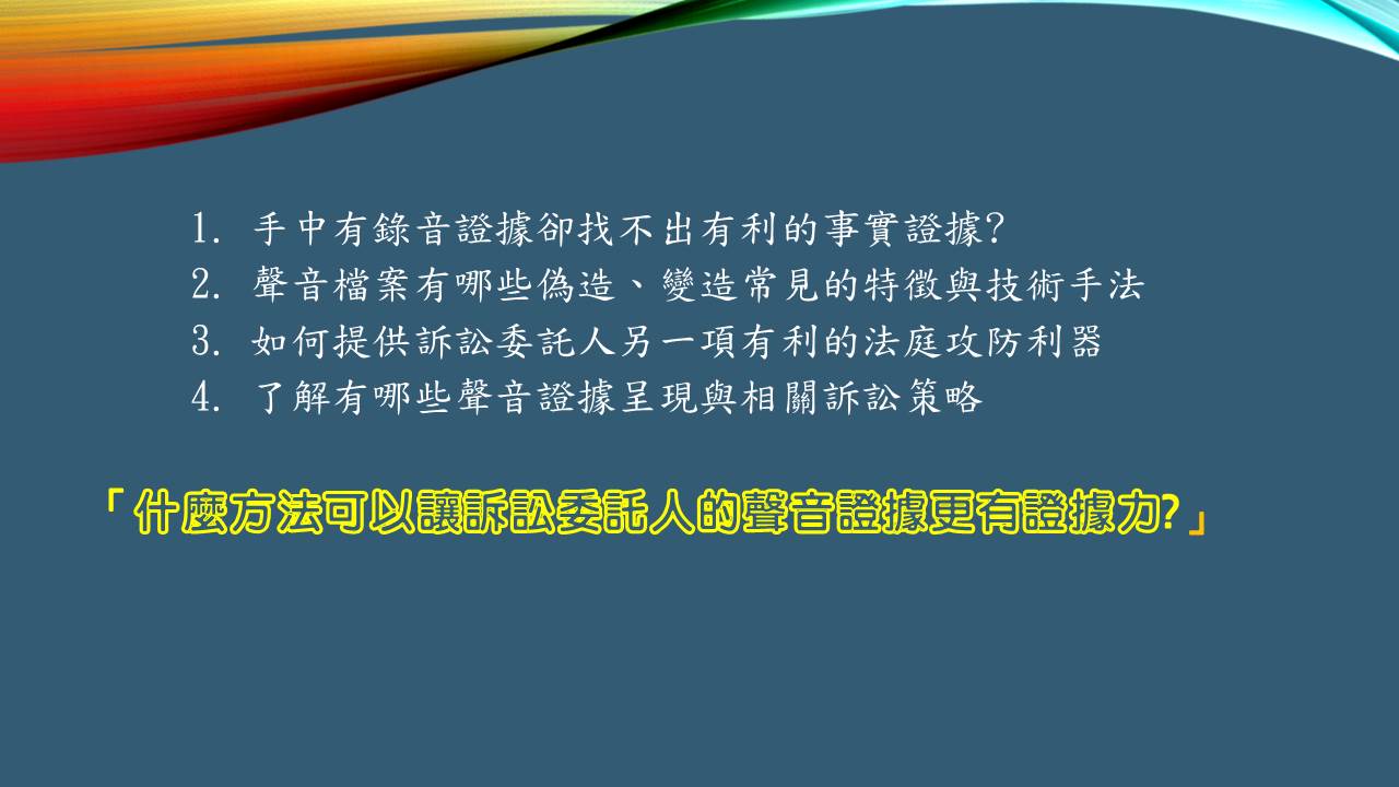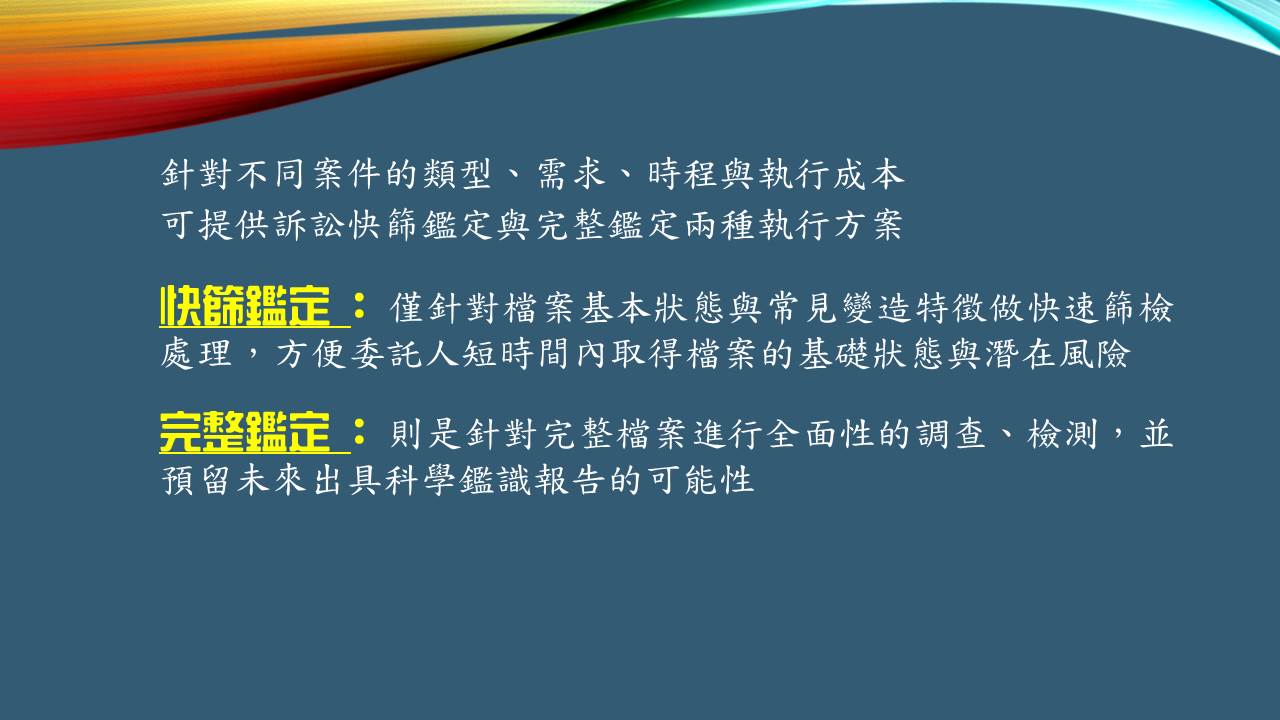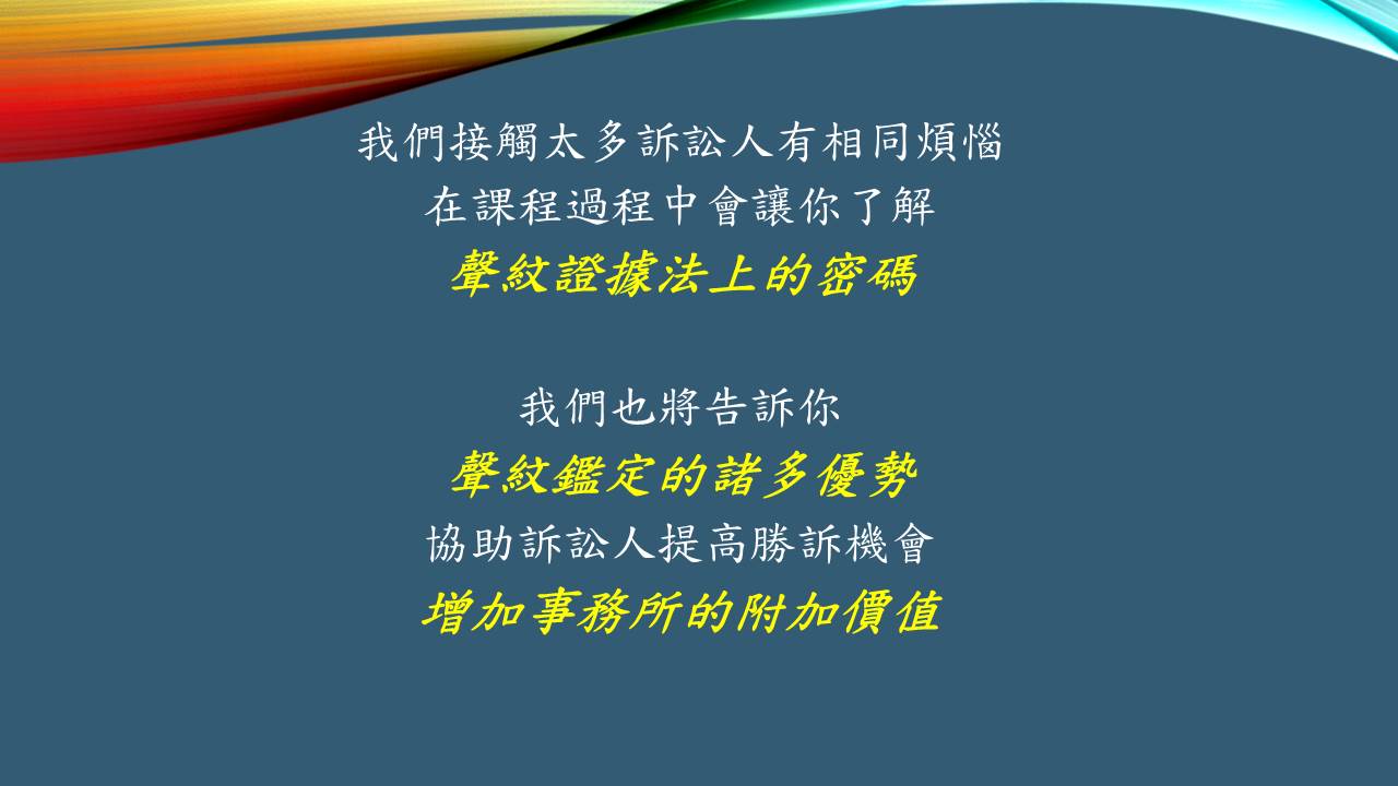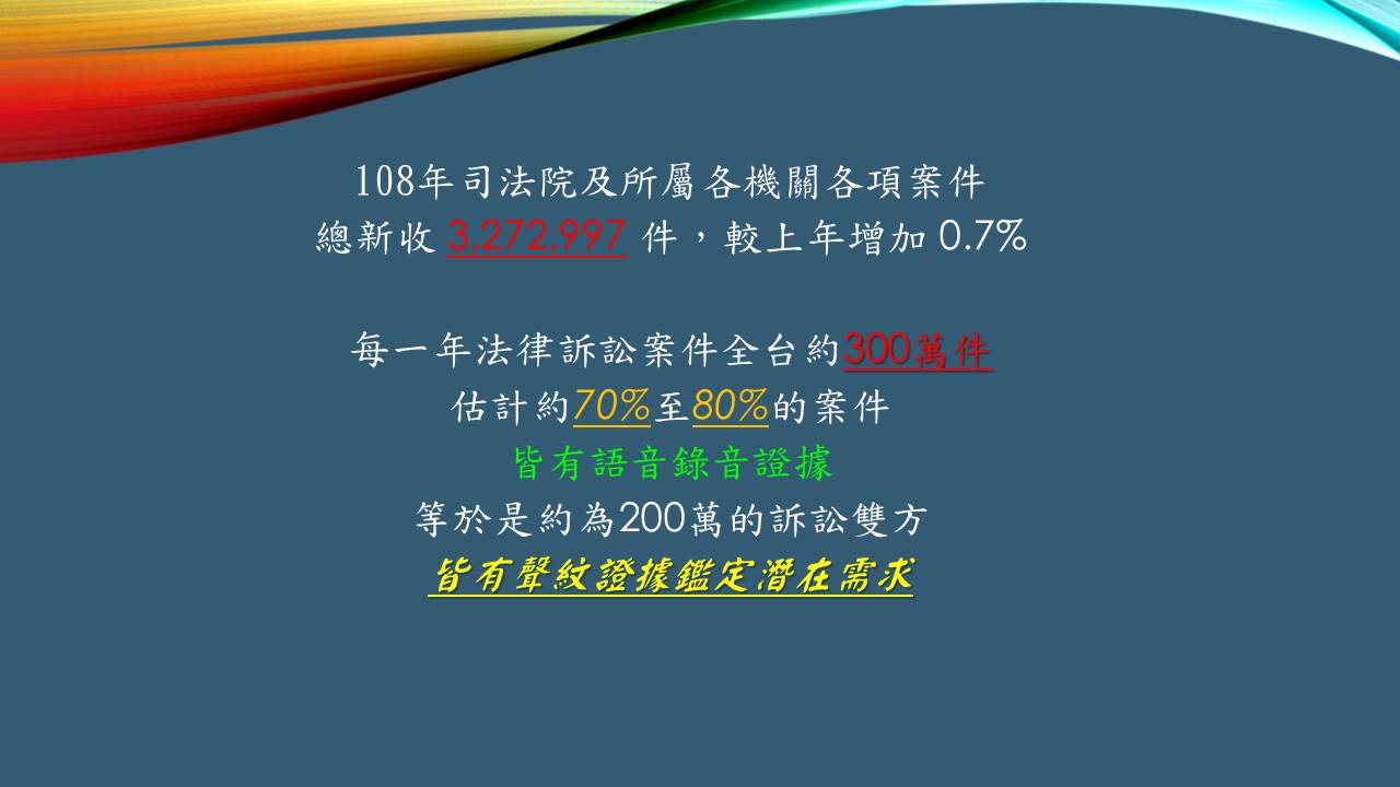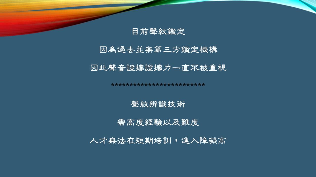 為全台民間唯一具備調查、鑑識、聲音基礎研究的公司,亦持續的提升鑑識與基礎科研的能量,以提供國內第三方公正鑑識機構充足完備的聲音鑑識後盾。