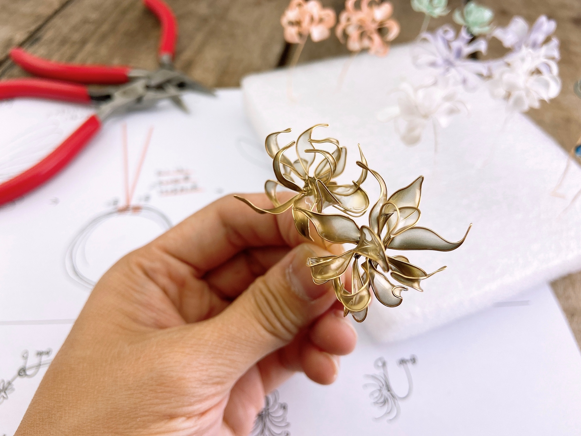 水晶花是類似水晶般晶瑩剔透效果的造花工藝,是製作當代首飾很受歡迎的技術,作品色彩鮮豔、薄而通透、無毒且能長久保存。