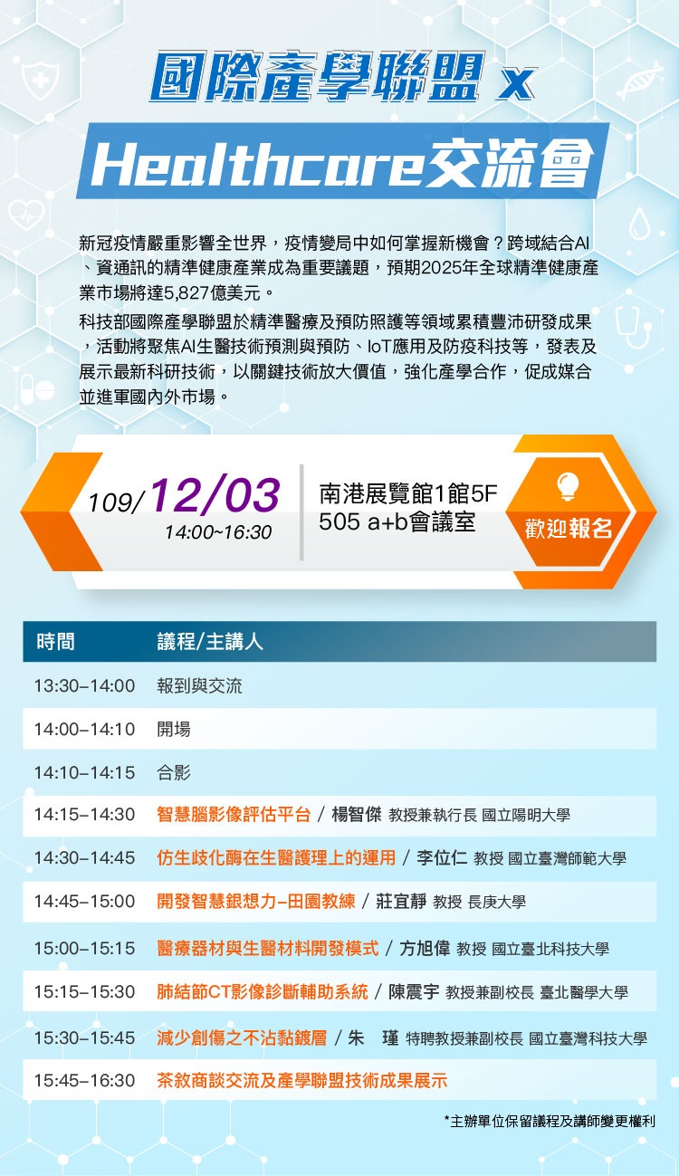 在疫情變局中掌握先機、接軌全球醫療及生物科技產業,國際產學聯盟鏈結社團法人國家生技醫療產業策進會,於台灣醫療科技展期間打造國際產學聯盟 X Healthcare交流會,發表科研技術成果聚焦AI生醫技術的預測與預防、精準醫療系統及IoT應用研發等,以關鍵技術放大價值,加速學界能量產業化,展現國際產學聯盟學校專業實力並拓展媒合需求與技術推廣。