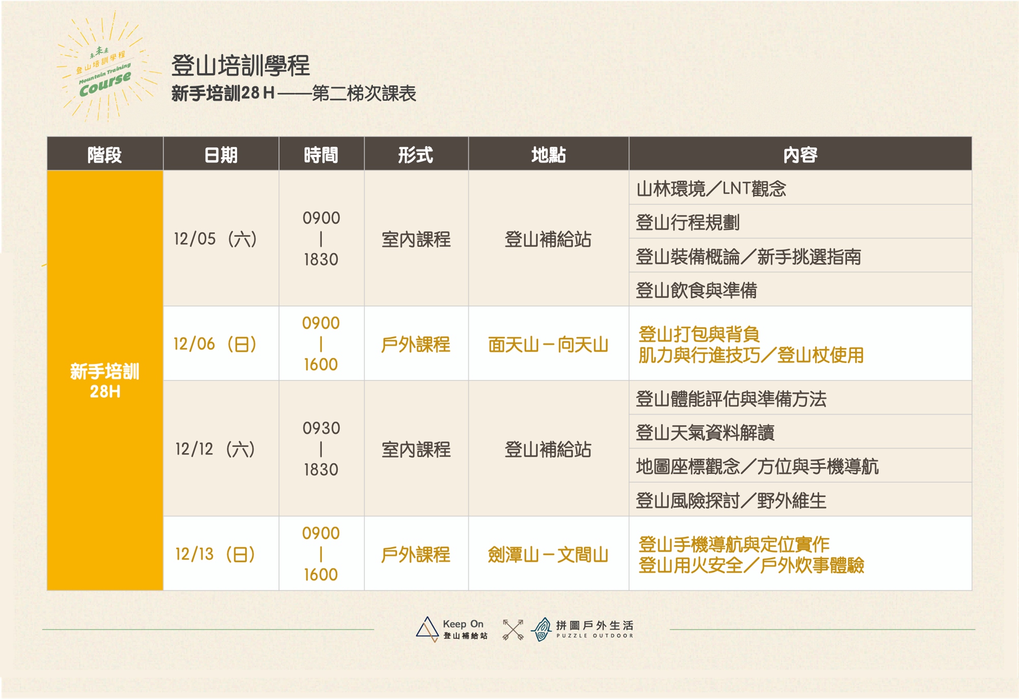 兩個階段加起來共60小時,本次系列培訓因應而生,扎實的培訓,最適合大家的登山起點。