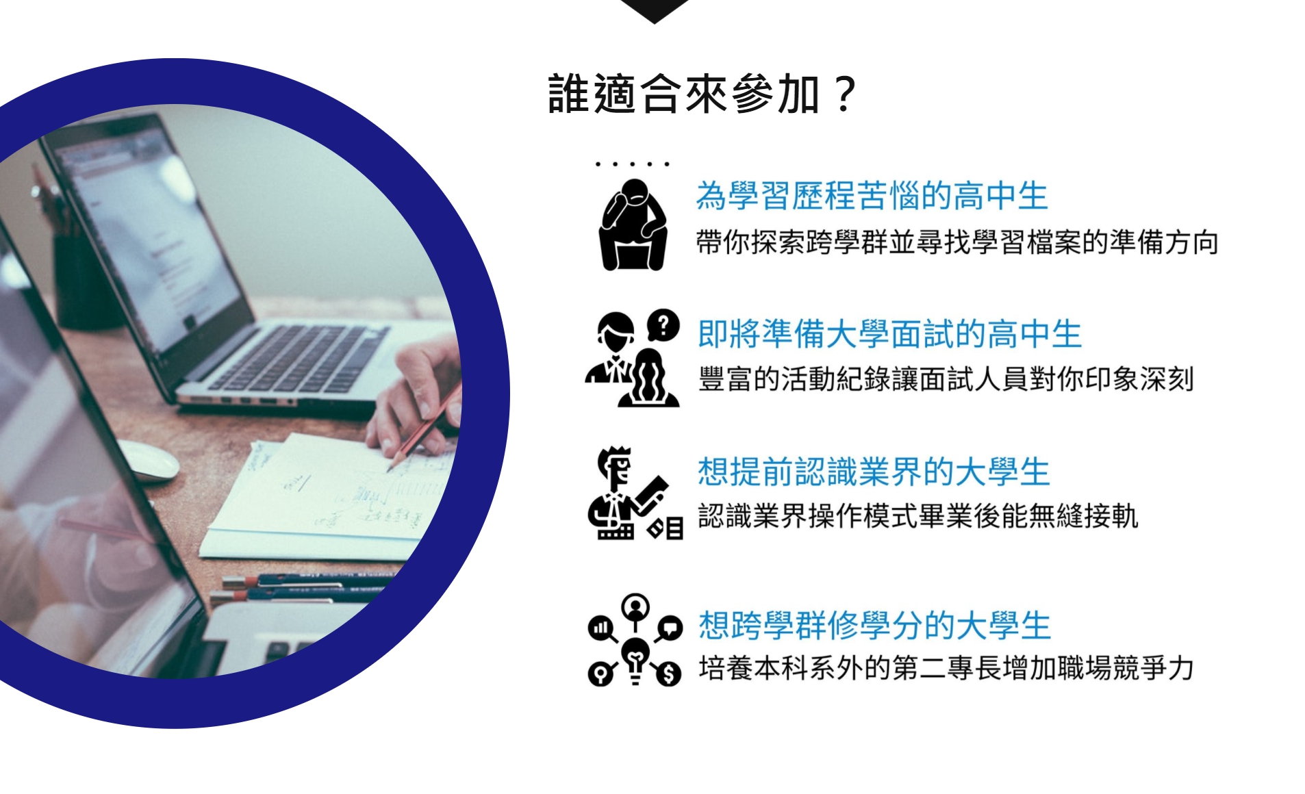 加碼!科系探索與學習歷程專家.啟夢創辦人-許匡毅講師 將特別南下,分享獨創的「全面探索科系方法」引導學員了解學習檔案的內容架構,期望學員在營隊後能夠進一步針對自身有興趣的科系進行加深加廣的學習。