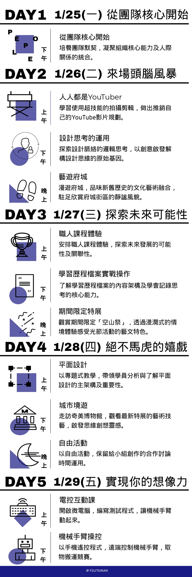活動時間:110 年 1 月 25 日(一)至 1 月 29 日(五),五天四夜。