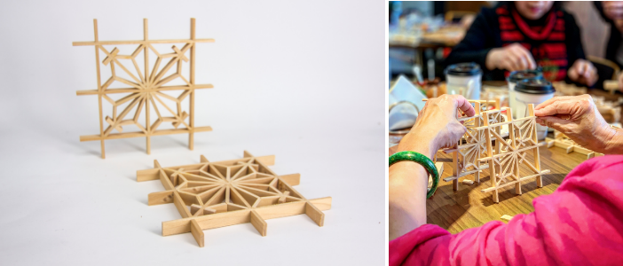 組起數根木條,那元件之間看似毫無關聯,但在師傅的組裝之下,窗花漸漸成形,簡直魔術一般!陳正忠說:「在設計之初,師傅必須將圖案拆解成幾個連續性的線條,再將木條切割加工成元件,而這些就是拼成窗花的重要關鍵。」木工廠裡被劃分為數個加工區,木料必須經過整平、切割、洗溝、打型等工序,完成的組件必須尺寸均一,才能夠精準對位,呈現出方形、菱形、圓形,甚至更加複雜的圖騰。