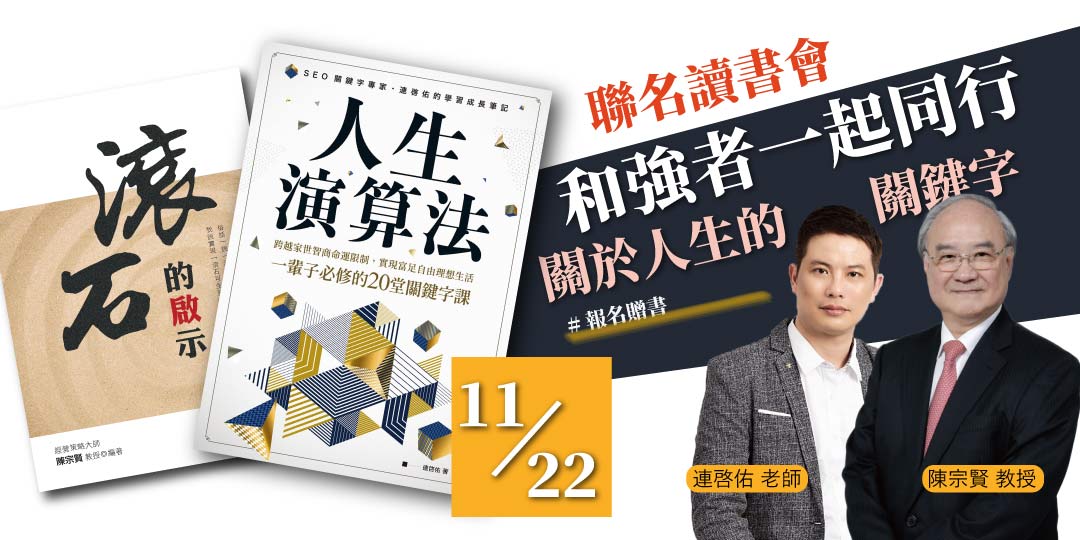 這次的主軸不僅僅只是讀書會型式,更以兩位強者的對談為賣點,相互交流對於自我成長歷程的想法與關鍵。隨著連啓佑老師的新書《人生演算法》帶來更多嚮往不斷優化的成功意識,內容包括,如何從人生價值、職場關係、創業真諦、經營方法到生涯抉擇,發現生命中的關鍵問題,並在不斷優化的過程中找到學習成長的方法。而陳宗賢教授更以《滾石》一書來與各位互動,滾石是陳教授的自傳與成功心得,也是許多企業人士非常喜愛的一本書。